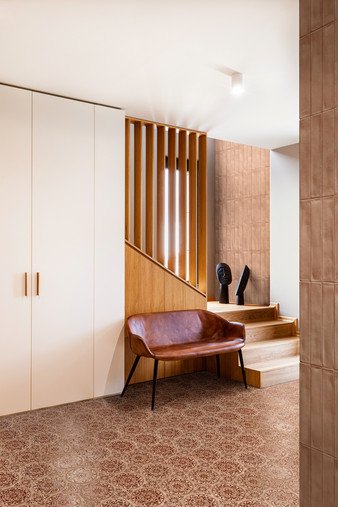 L’effetto finale è quello di uno spazio piccolo ma ben risolto, dove materiali, luce e proporzioni dialogano con eleganza, dando forma a un passaggio che diventa parte dell’identità della casa.
