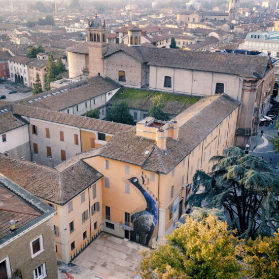 Monumentale per impatto architettonico e per innovatività, Curiosa Meravigliosa si compone di ben 30 lastre di 120×240 cm in gres porcellanato foto-impresse che integrano l’architettura esistente e completano l'intervento di riqualificazione della piccola piazza adiacente ai Musei Civici per riportare questo luogo al pieno utilizzo e per garantire un "nuovo" punto di incontro, cominciando dall'arte, attraverso un’azione di coinvolgimento attivo della comunità.