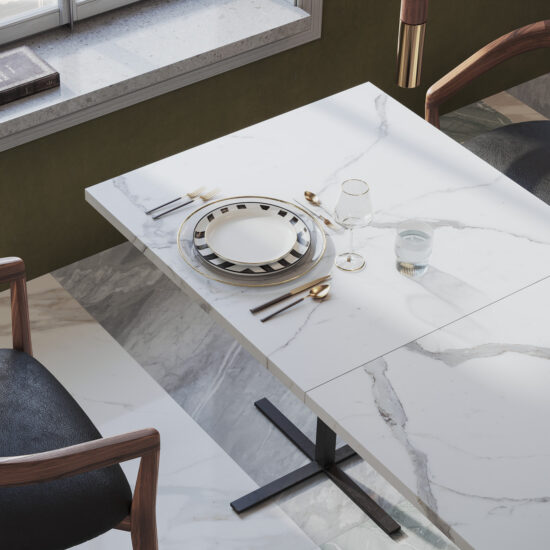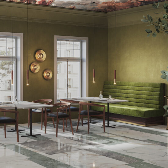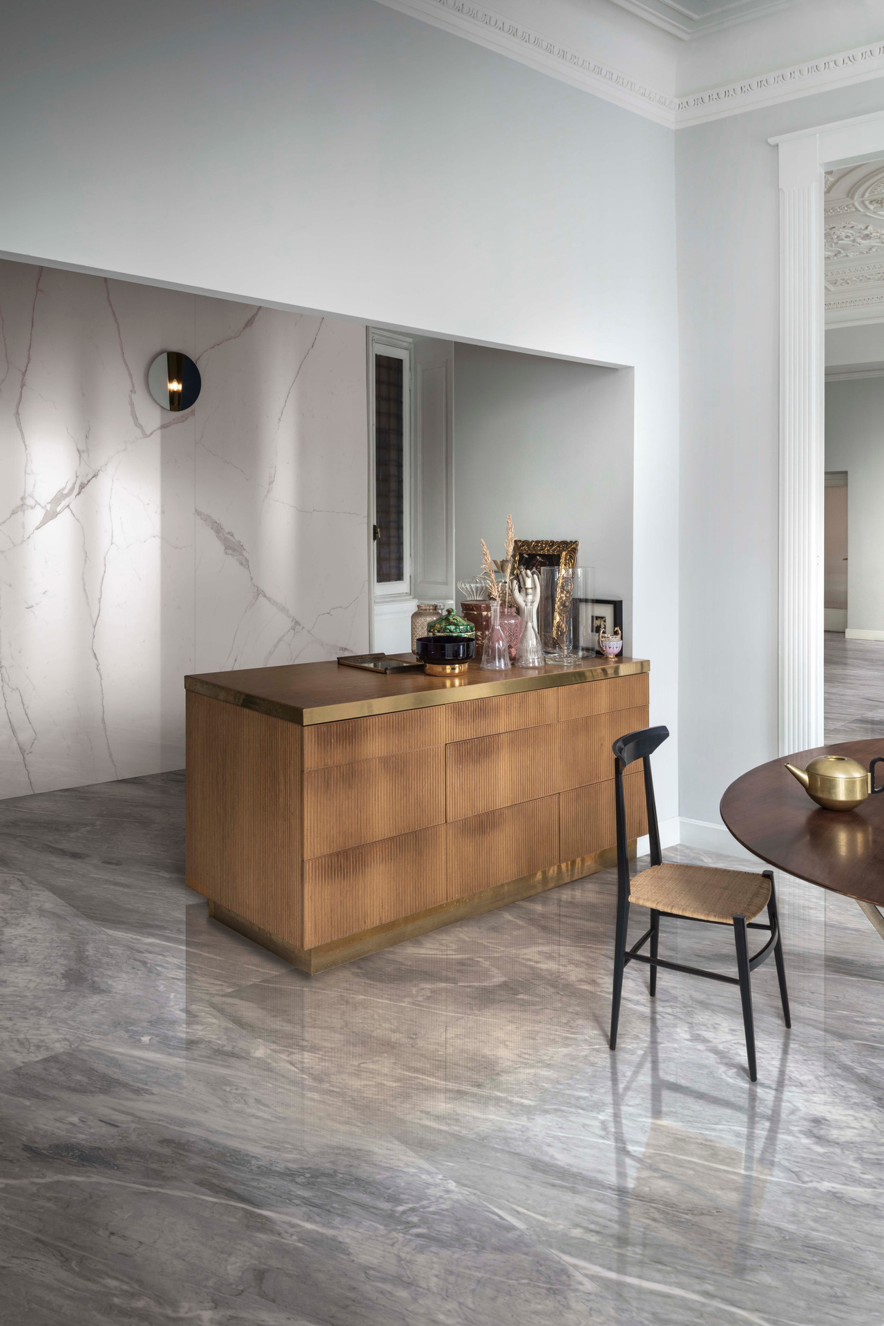 Accade così che un Calacatta Nobile possa condividere il disegno delle superfici di uno spazio con un Breccia Pernice, denso e riccamente frammentato, o con un Grafite, più compatto e delicatamente venato a contrasto. O anche che un ricco e sontuoso Emperador rafforzi il carattere prezioso ed esclusivo di un pavimento o un rivestimento in Statuario Venato.