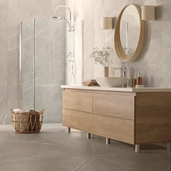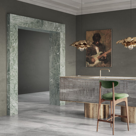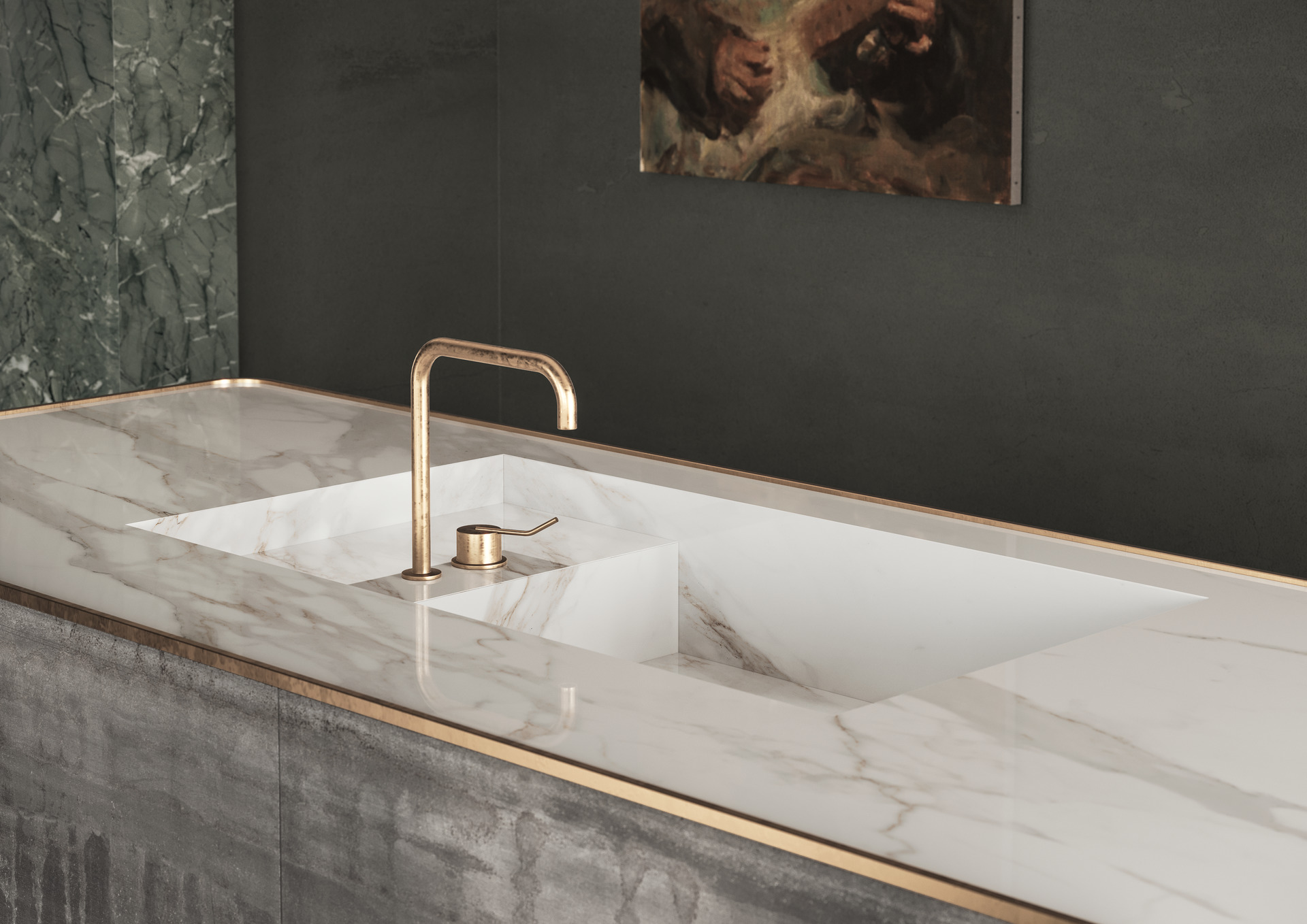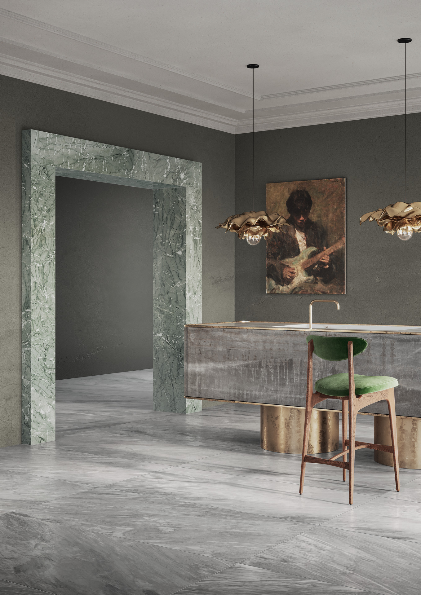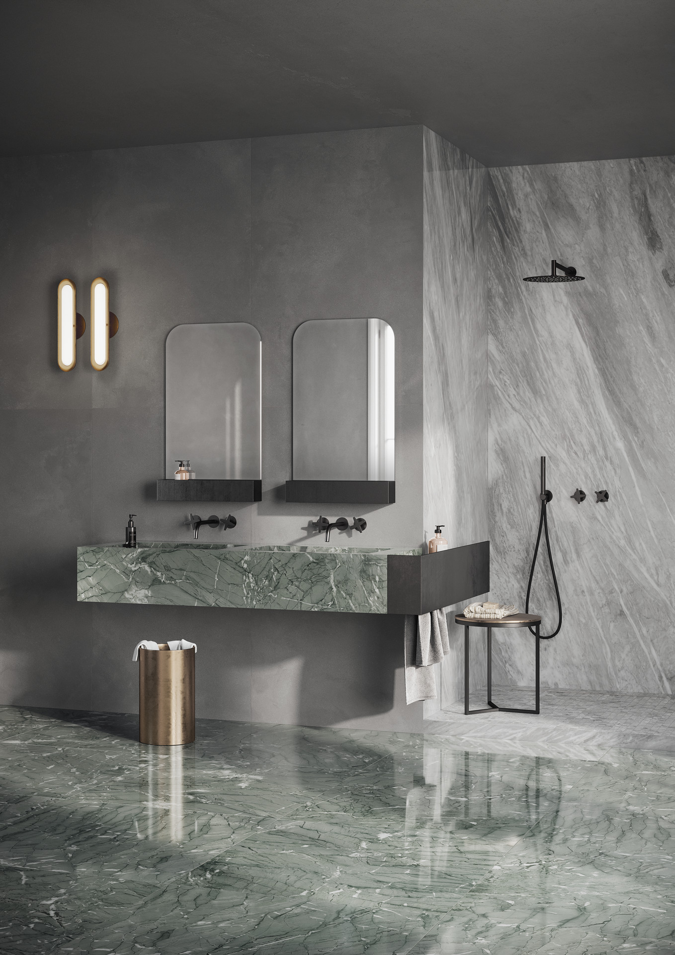 Da testare, per un touch contemporaneo ed esclusivo, l’accostamento delle lastre di Incanto con i gres effetto resina, legno o cemento, così come l’abbinamento a una palette di tinte a parete dal carattere ricercato e sartoriale.