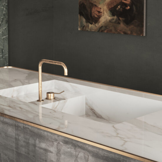 Le grandi lastre con lato 120 cm di Incanto presentano uno spessore ridotto a 6 mm, offrendo così la possibilità di rivestire in coordinato a pareti e pavimenti anche elementi d’arredo fissi e mobili, oltre che elementi funzionali come lavabi e moduli da cucina, realizzando un ideale total look.