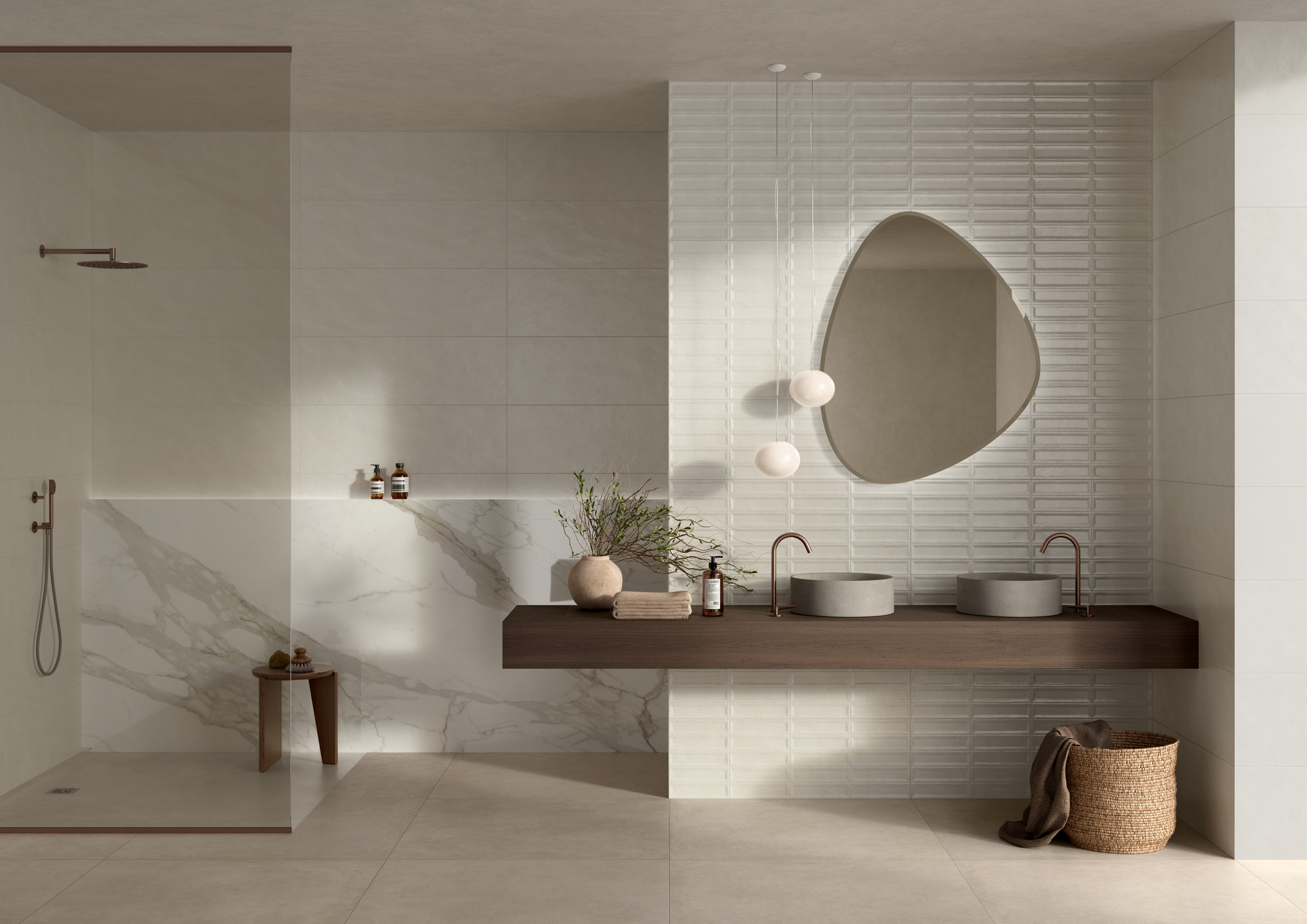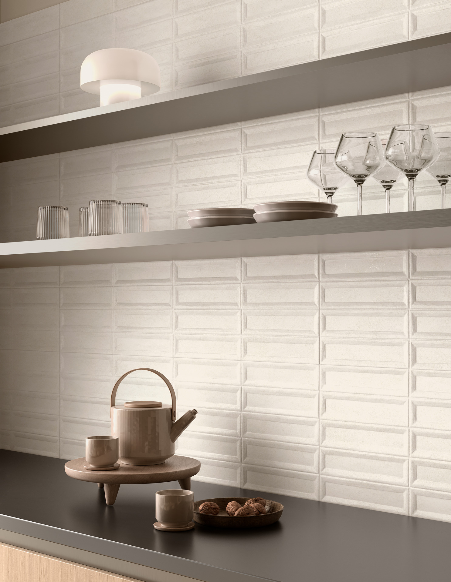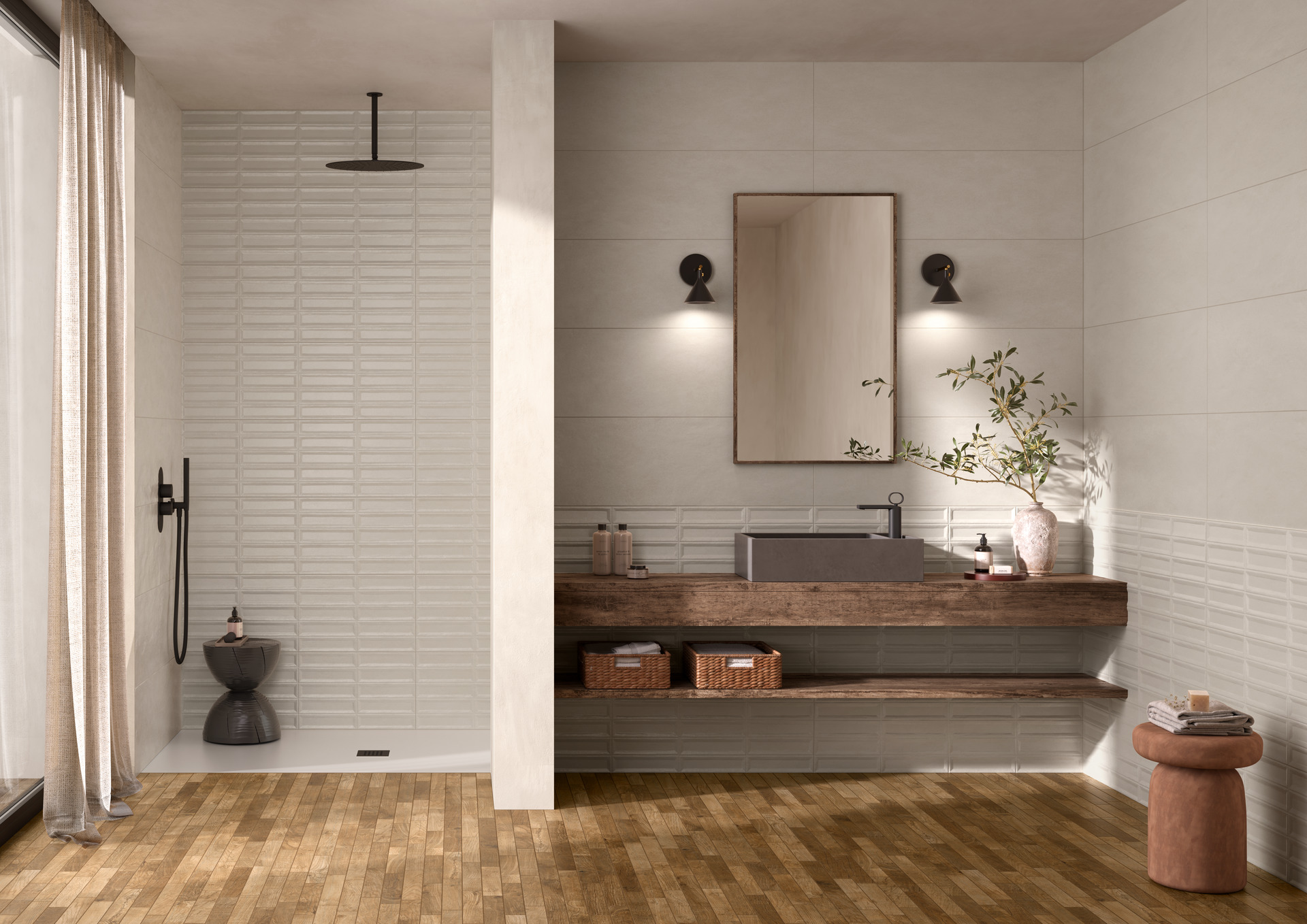 La serie si sviluppa nel formato unico 33×100 cm e in due tonalità neutre e versatili: Pomice, la più chiara, e Calce, leggermente più scura. Ai due fondi si affiancano due strutture tridimensionali e un decoro che amplificano la forza espressiva del progetto.