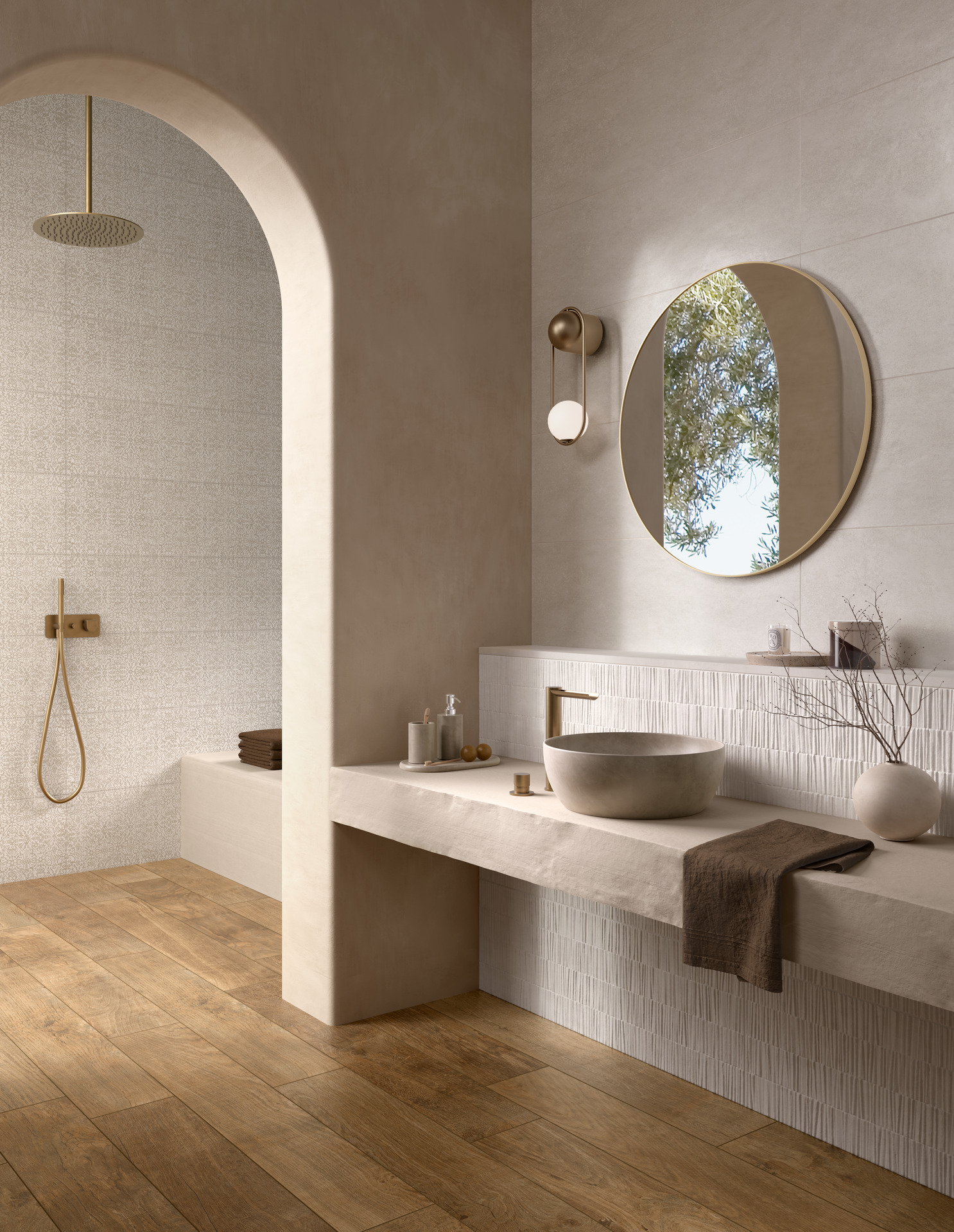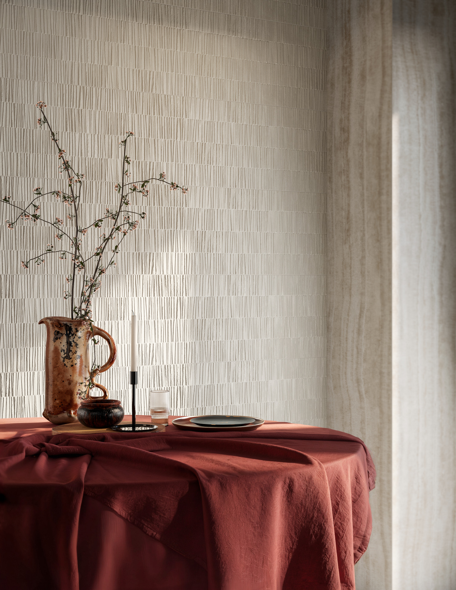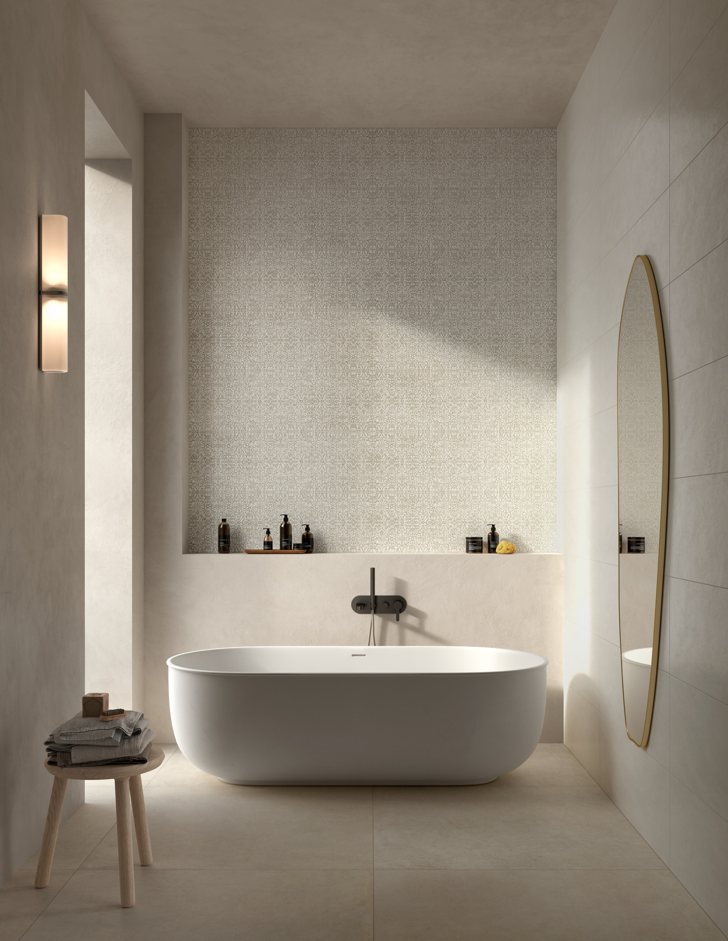 La serie si sviluppa nel formato unico 33×100 cm e in due tonalità neutre e versatili: Pomice, la più chiara, e Calce, leggermente più scura. Ai due fondi si affiancano due strutture tridimensionali e un decoro che amplificano la forza espressiva del progetto.