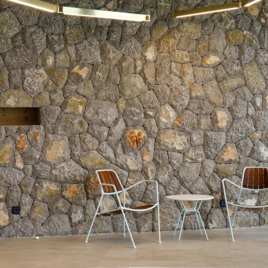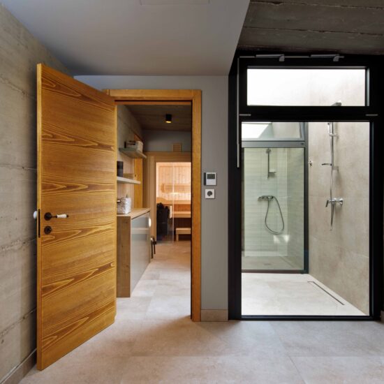 La versione “Noce” di Realstone Jerusalem, gres effetto pietra dalla grafica variegata e venata, accomuna tutti gli spazi, ma le superfici della collezione si adattano di volta in volta alle esigenze progettuali. Internamente è stato utilizzato un gres spessore 10 mm, mentre nell’area esterna e attorno alle piscine sono state posate piastrelle con spessore 20 mm, più resistente e antiscivolo. La gamma Realstone Jerusalem XT20 mm, peraltro, permette anche la posa flottante e quella a secco su ghiaia, sabbia o erba. Questa seconda tipologia di posa è stata sfruttata nell’aera esterna alla seconda villa, riprendendo lo stesso effetto materico e colore.