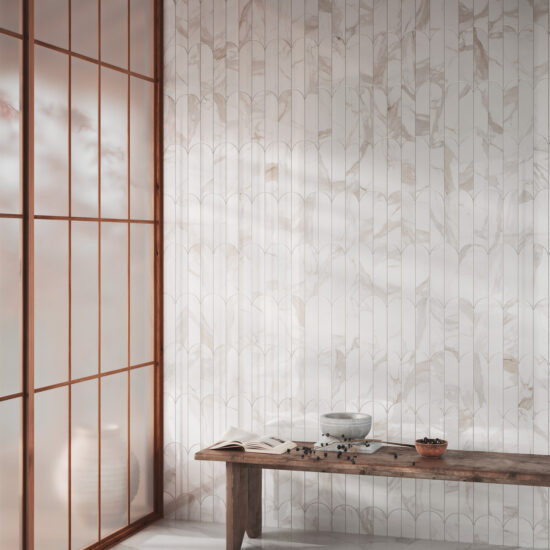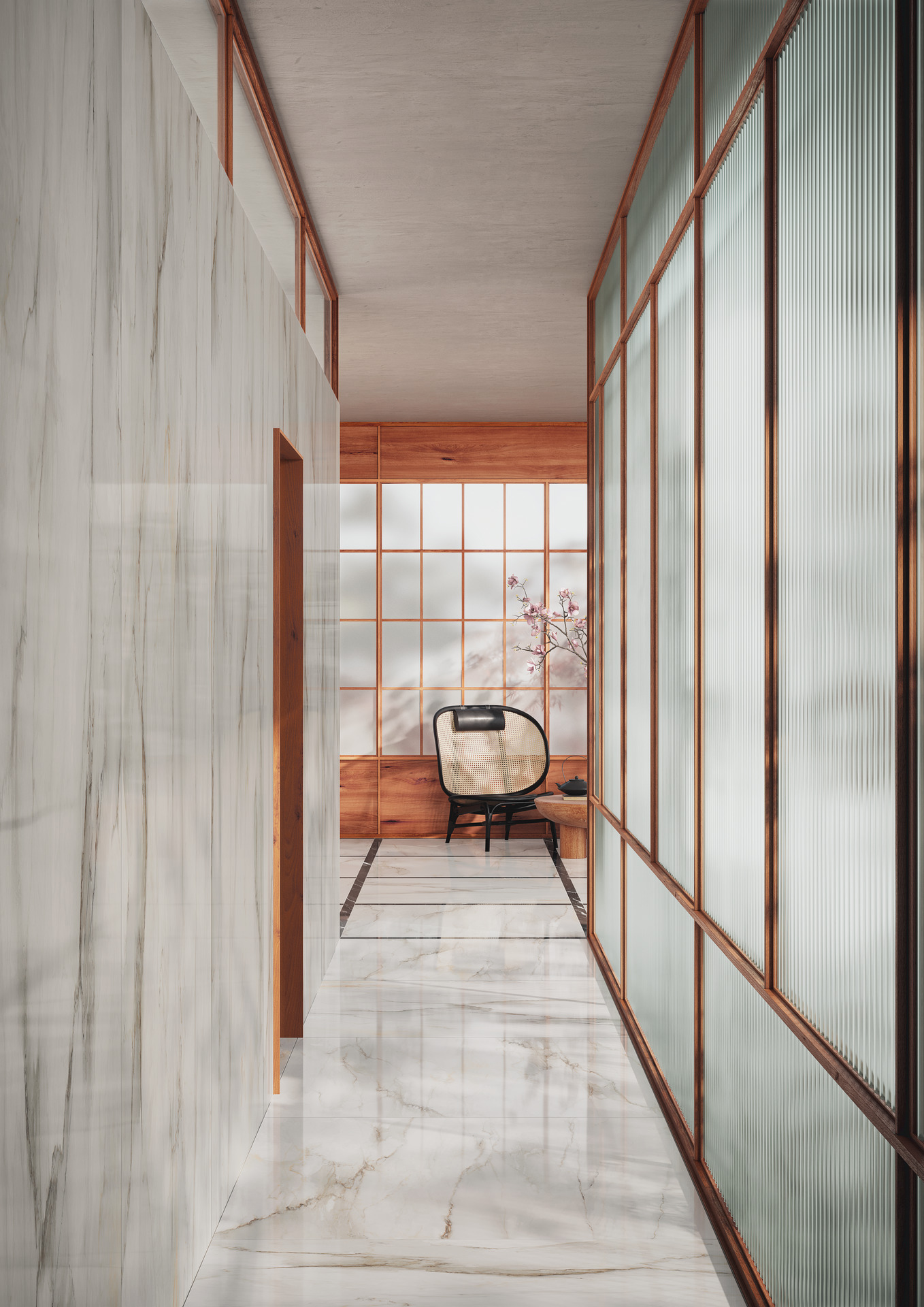 La collezione Incanto trae spunto dal Sol Levante e percorre un viaggio tra ambienti armonici e accoglienti: le lastre marmoree vengono utilizzate per disegnare suggestive geometrie regolari. La palette presenta 13 colori d’ispirazione organica tra venature dall’effetto marmoreo. Gli sfondi sono delicati e fluidi, a ricreare un contesto domestico armonico e accogliente.