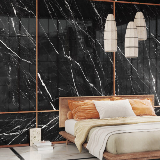 Dall’ingresso si intravede lo scorcio di un ambiente privato: è la camera da letto, dove il grande formato 120×278 cm Sky Black Glossy si posa sulle pareti a esaltarne la pulizia delle forme, l'essenzialità dei materiali e degli arredi. L’orditura geometrica bicolor delle lastre posate a pavimento richiamano i tatami, definendo con sobrietà gli ambienti della casa.
