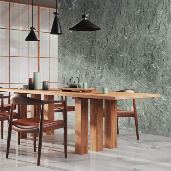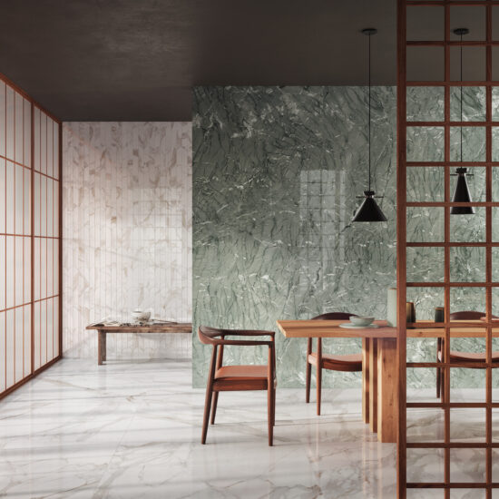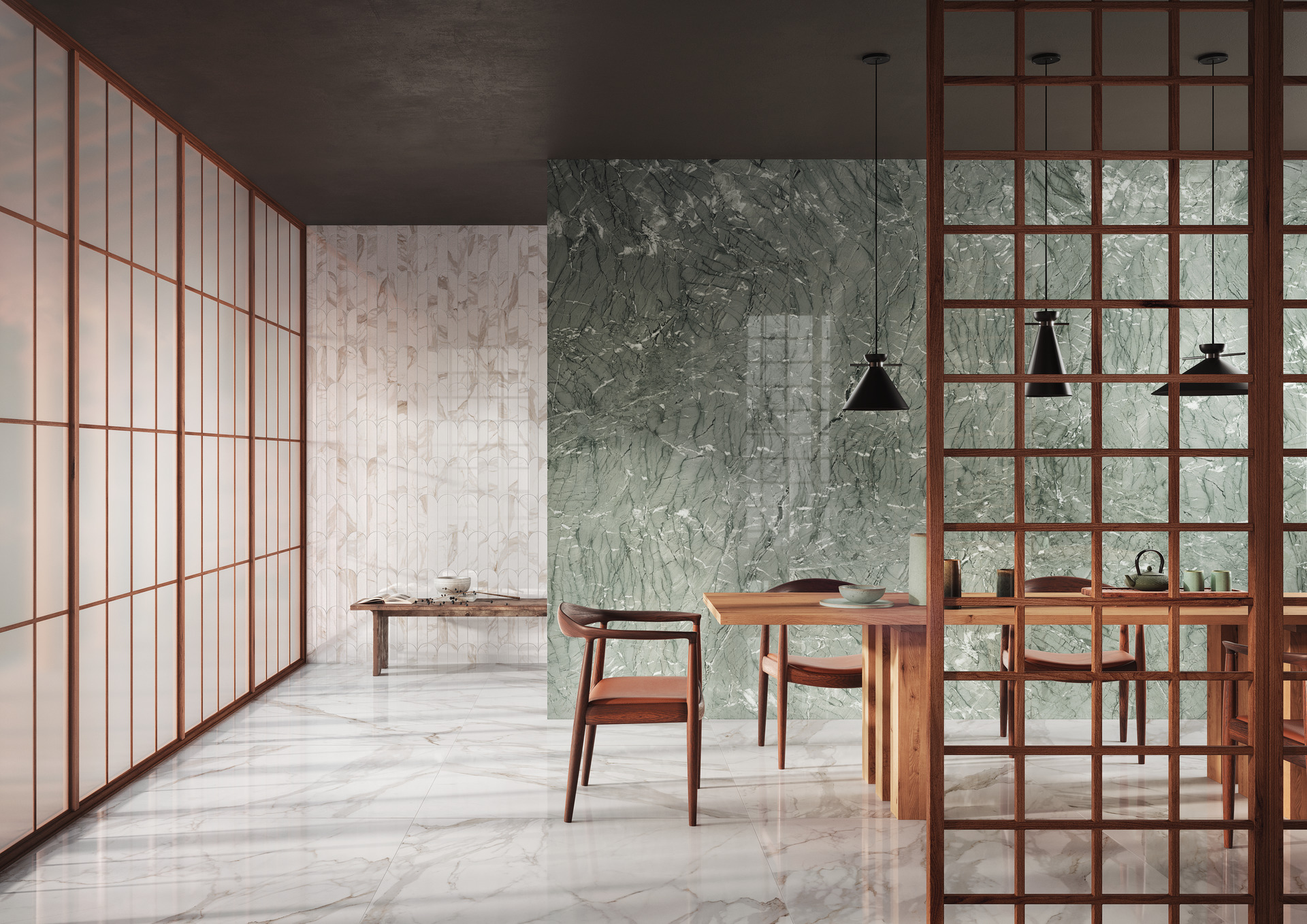 Torniamo nella grande sala da pranzo, cuore della casa, dove si consuma la cerimonia del the. Lo spazio è circondato da pareti rivestite con le lastre Verde Antigua, richiamo delle ceramiche celadon, da abbinare alle piastrelle Mosaico Ventaglio Calacatta Nobile nella finitura glossy.