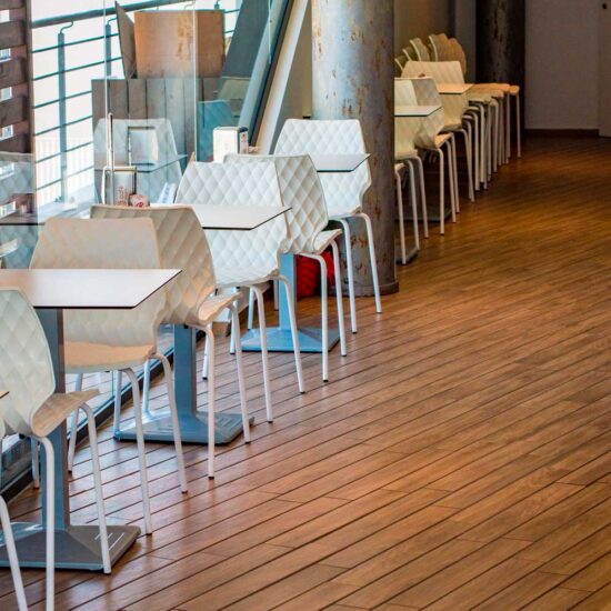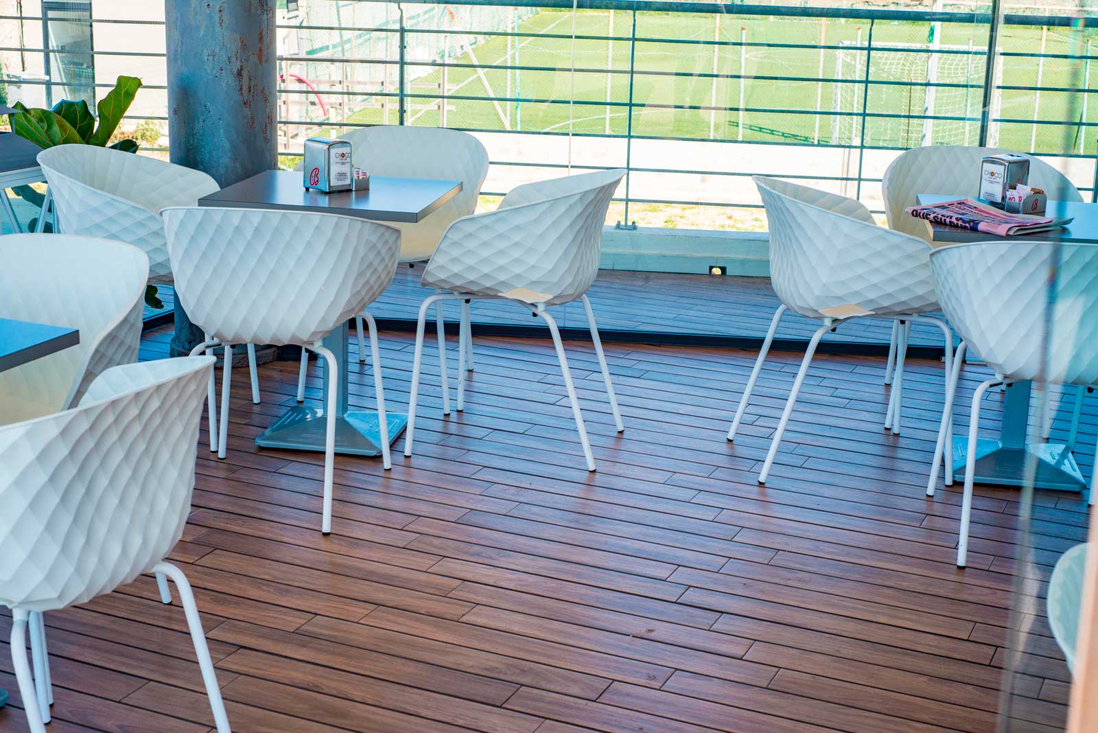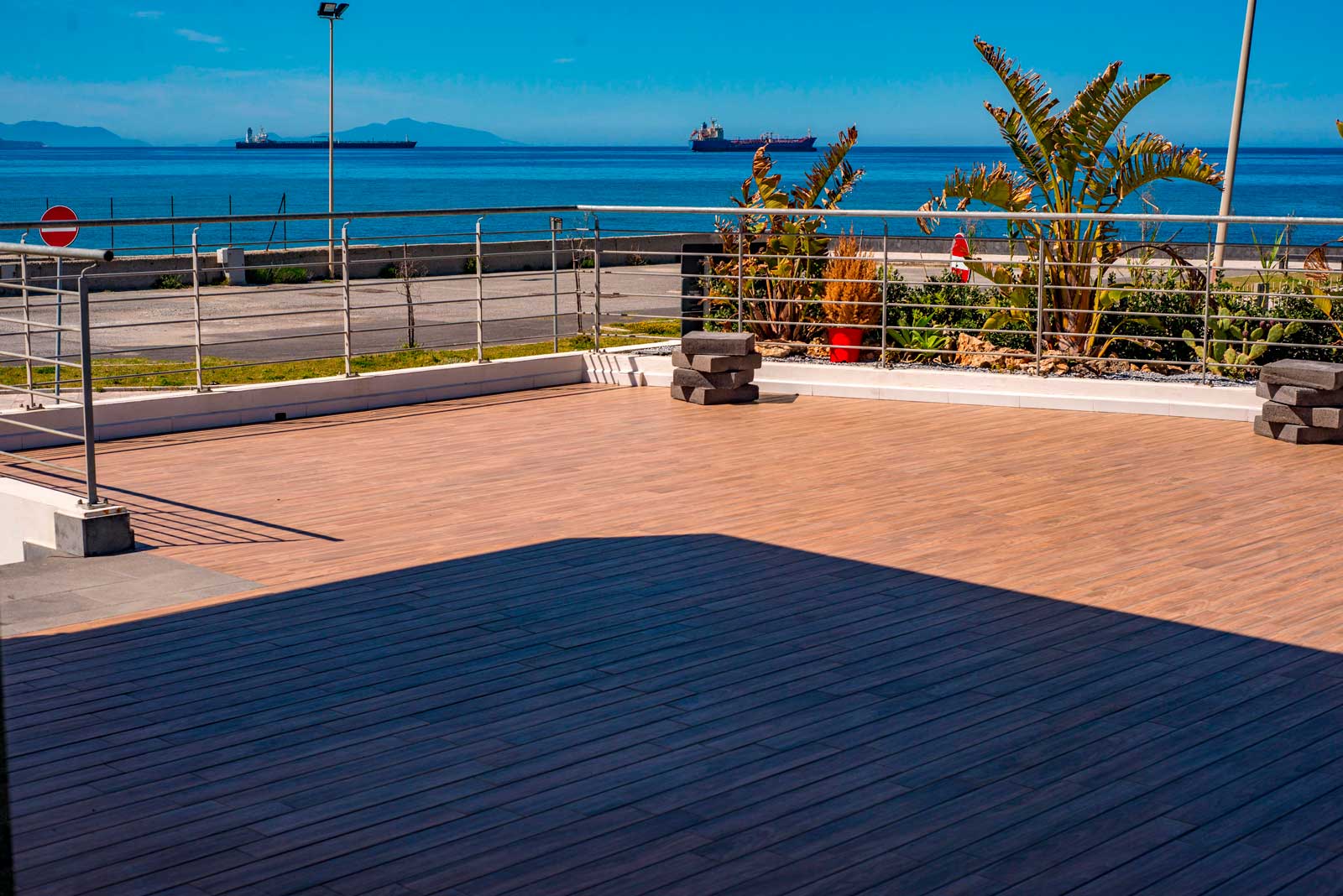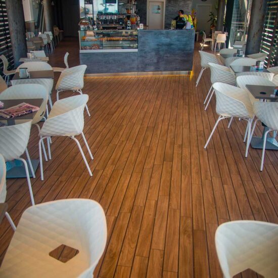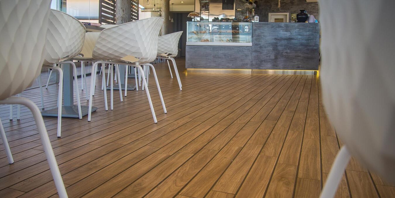Una pasticceria cioccolateria siciliana con terrazza affacciata sul Mediterraneo unisce indoor e outdoor con il gres effetto legno Woodessence di Ragno