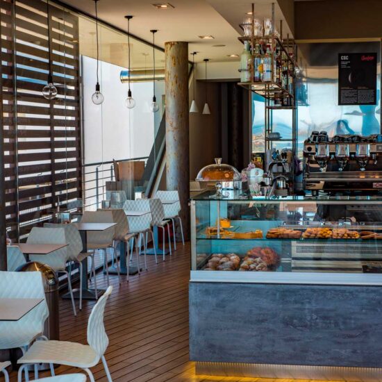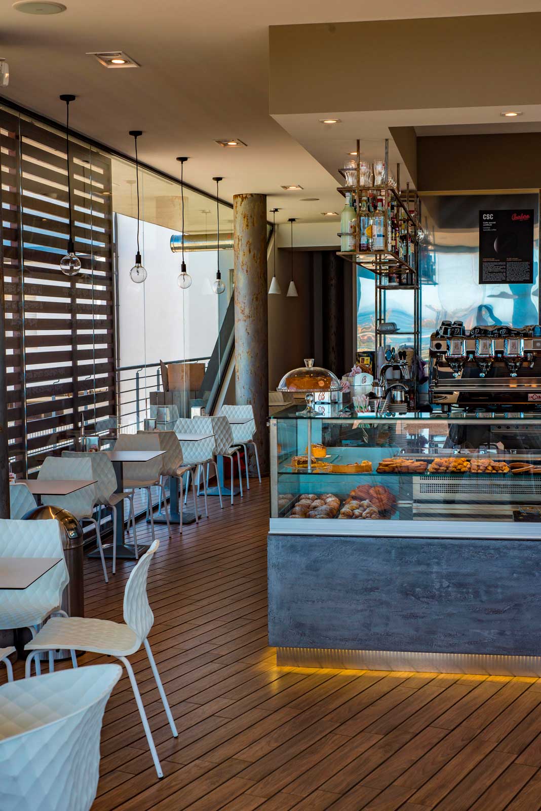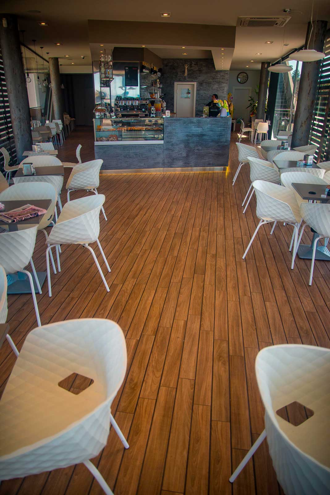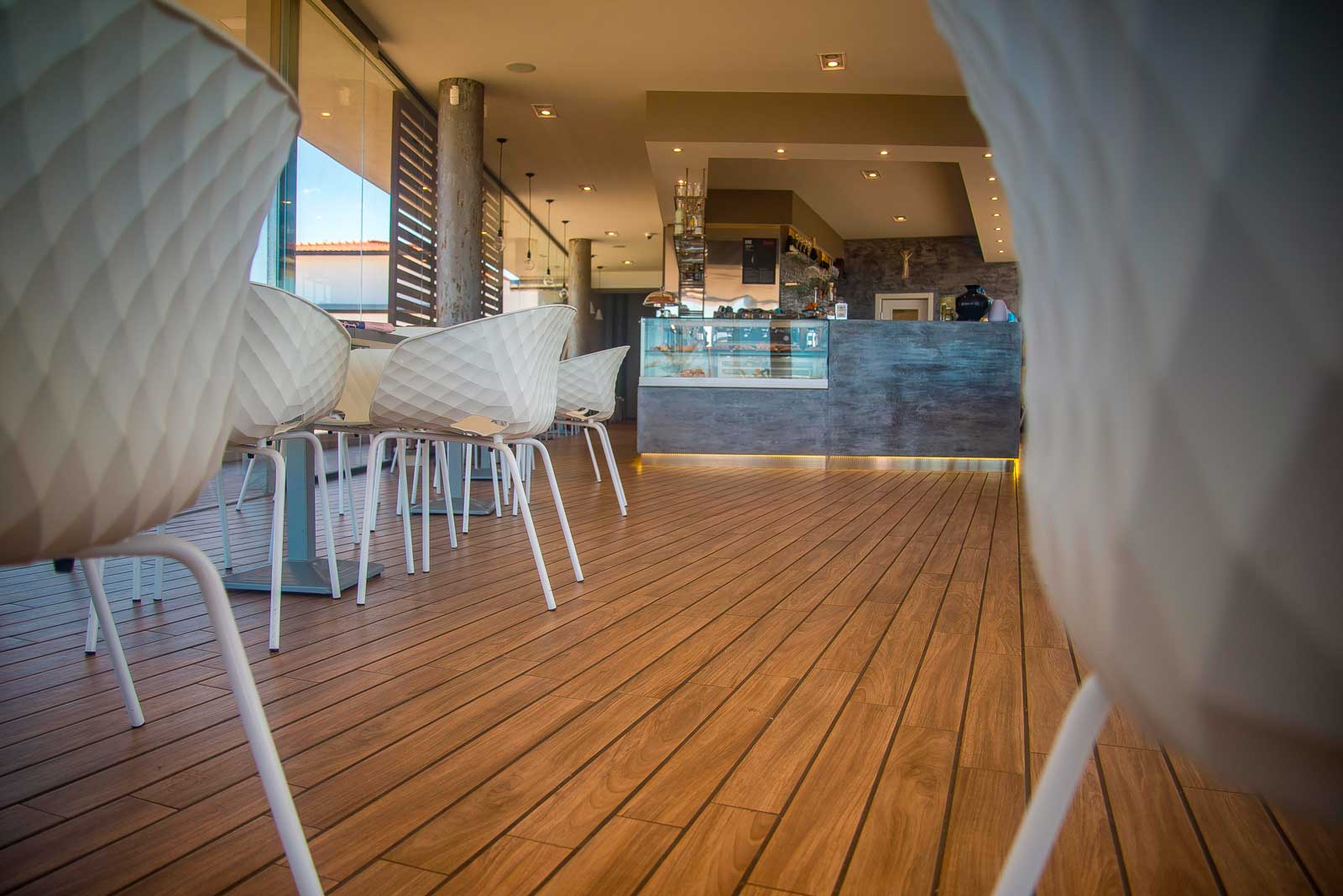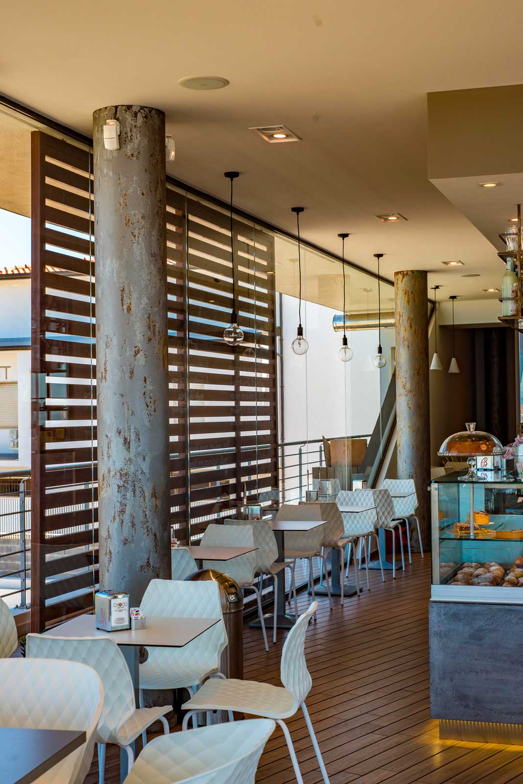 La scelta della stessa pavimentazione permette di sentirsi nello stesso spazio sia che ci si trovi all’interno, ad ammirare il trionfo di dolciumi delle vetrine, sia che ci si trovi sotto gli ombrelloni della terrazza, ipnotizzati dal sole e dal mare.
