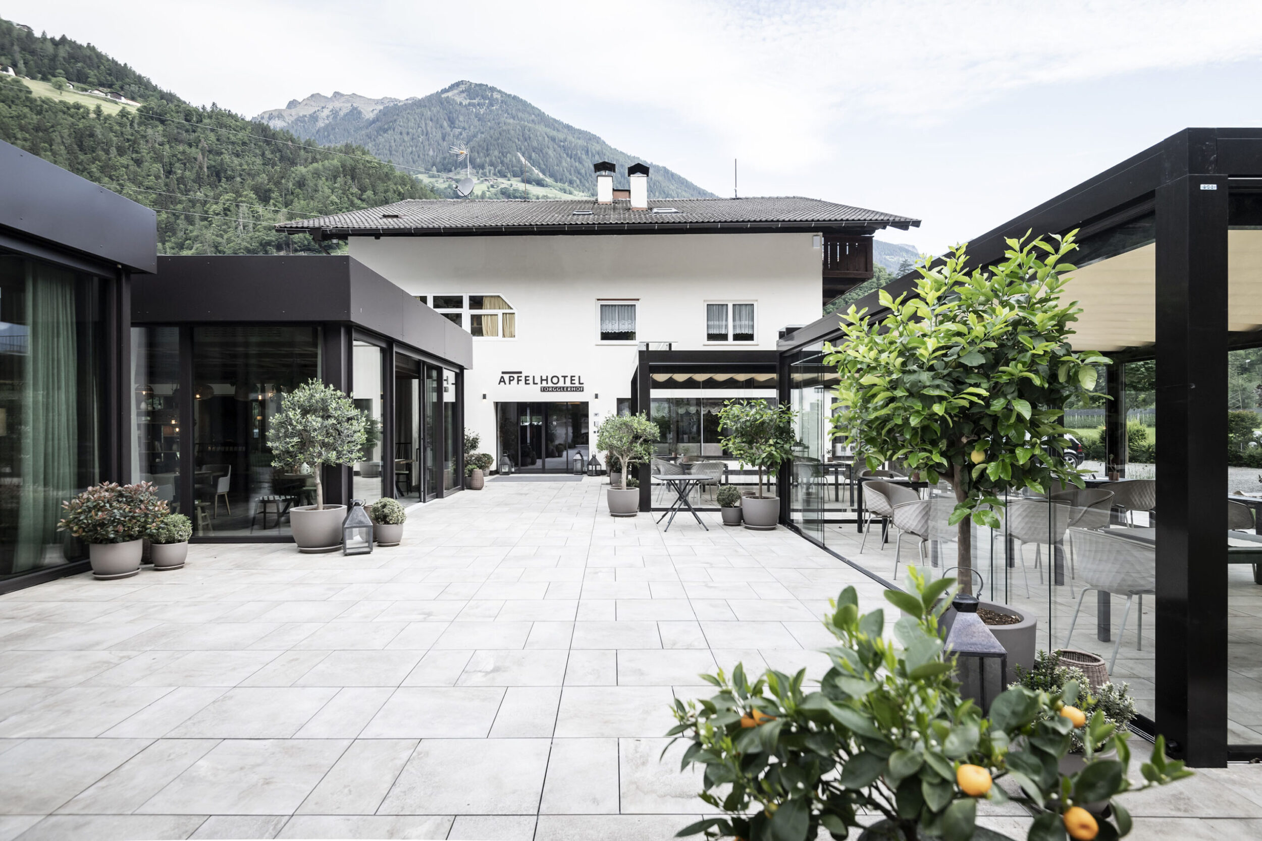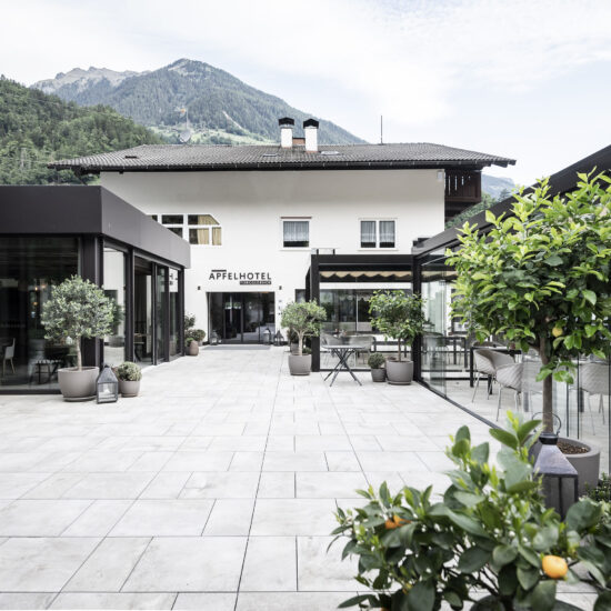 L’Apfel Hotel – letteralmente ‘Hotel della mela’ – è gestito da un nucleo famigliare arrivato ormai alla terza generazione. Questa famiglia sa accogliere e abbracciare il proprio passato per rinnovarlo in un progetto di continuità futuro. Ed è attorno a questo perno che si sviluppa l’innovativo progetto di ampliamento dell’hotel, recentemente completato nel maggio 2020.