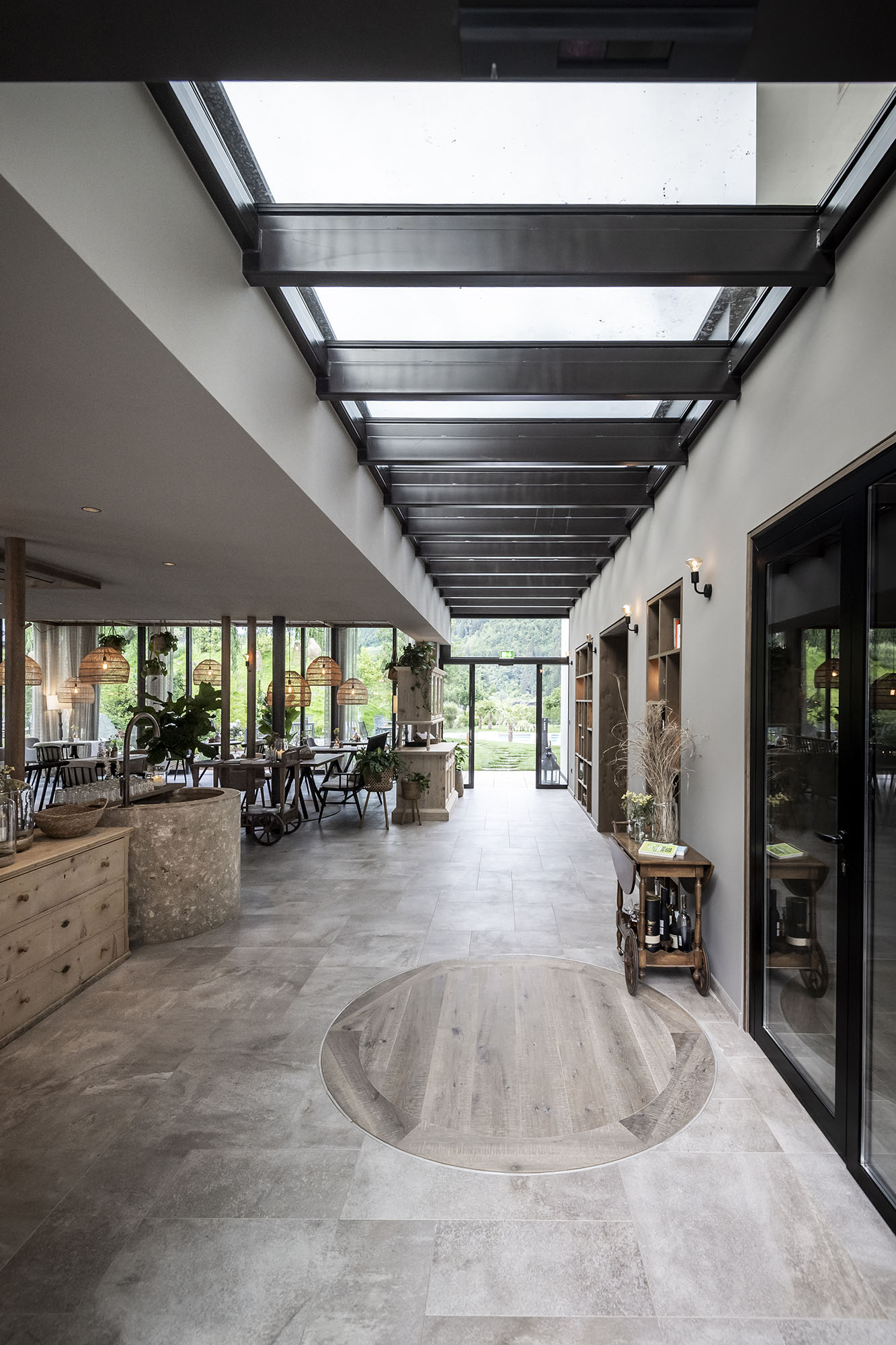 La collezione in gres porcellanato effetto pietra Stoneway Barge Antica è stata scelta per i rivestimenti del ristorante e della zona wellness; mentre la finitura Outdoor è stata selezionata per rivestire tutte le aree esterne, compresa la piscina.