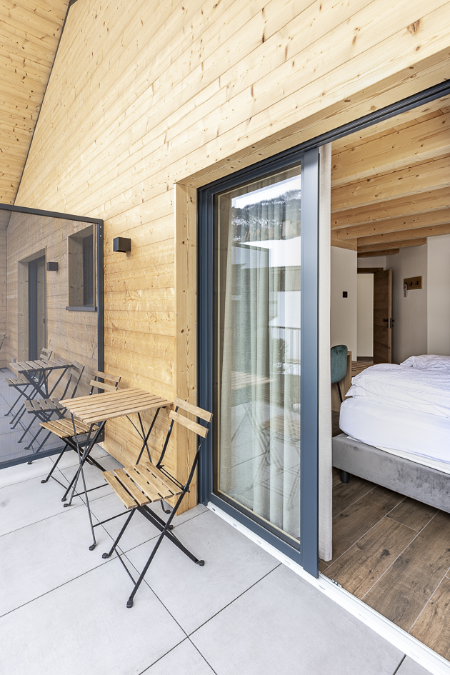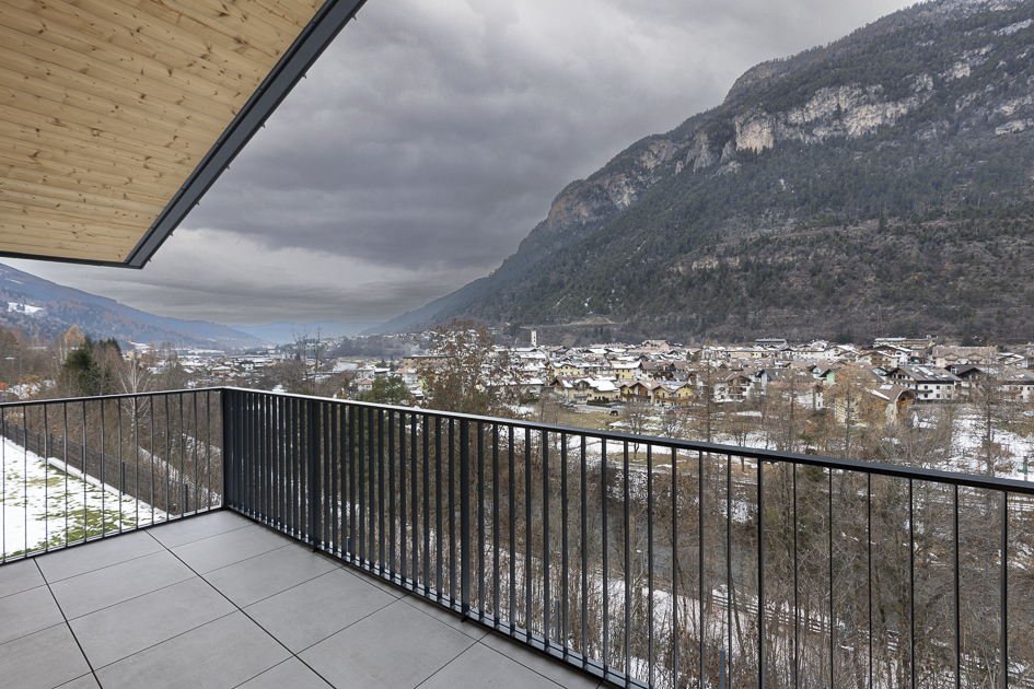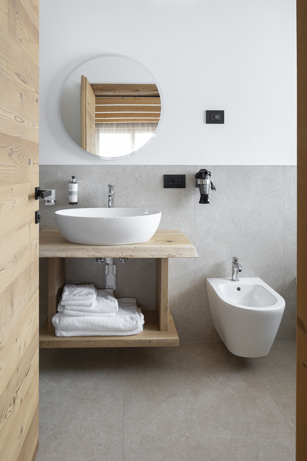 I balconi si aprono sul paesaggio montano e sono caratterizzati dalla collezione Viaggi Nichel 60×60.
