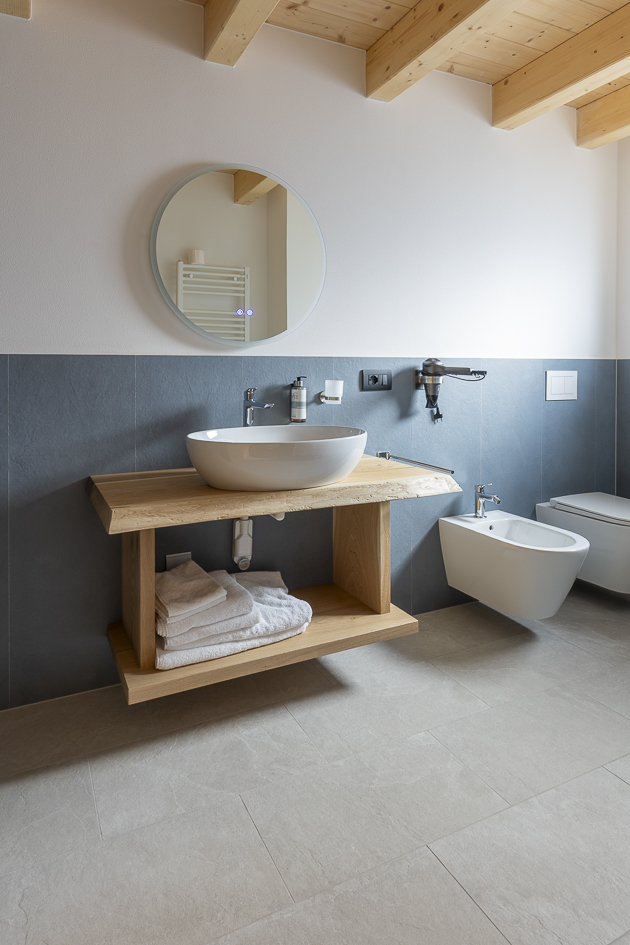 All’interno, i bagni diventano protagonisti grazie a un gioco di texture e cromie che crea ambienti sofisticati e dinamici. Nel primo bagno, il pavimento in gres effetto pietra Realstone_Slate, ispirato alla pietra Ardesia, dialoga con le pareti rivestite in Stratford Wall Blue, per un contrasto elegante e deciso.