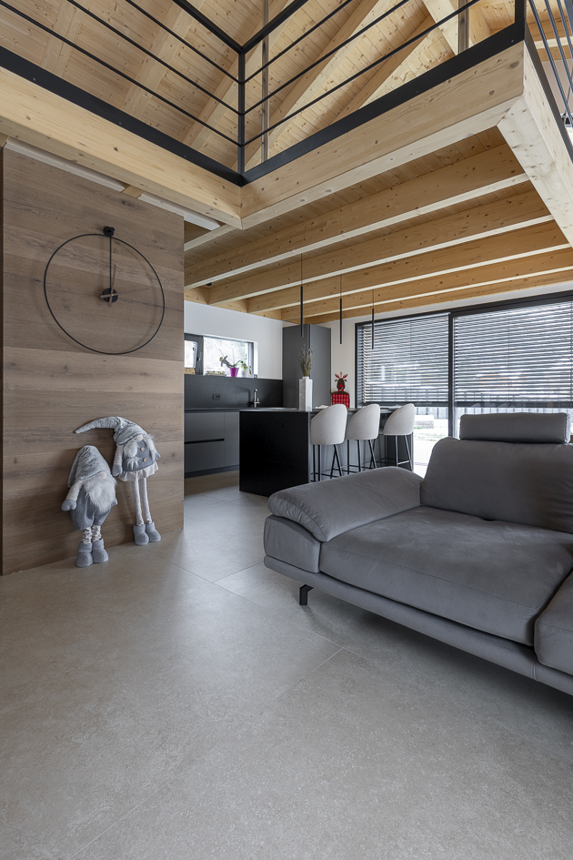 In cucina, il pavimento in gres effetto legno Woodtale Noce 20×120 regala un’atmosfera calda e naturale, con un carattere rustico ma dal gusto contemporaneo, mentre le superfici della zona giorno sono impreziosite dalla collezione effetto pietra Realstone_Travertino Cross Beige, che aggiunge eleganza e luminosità agli spazi.