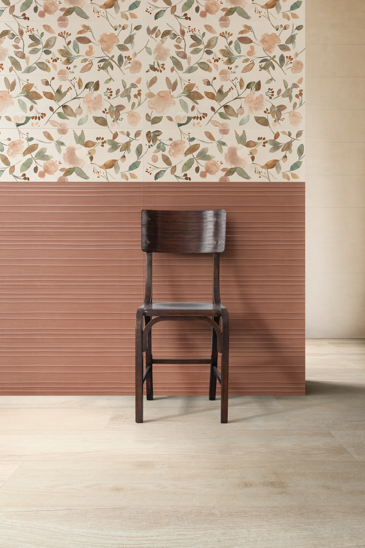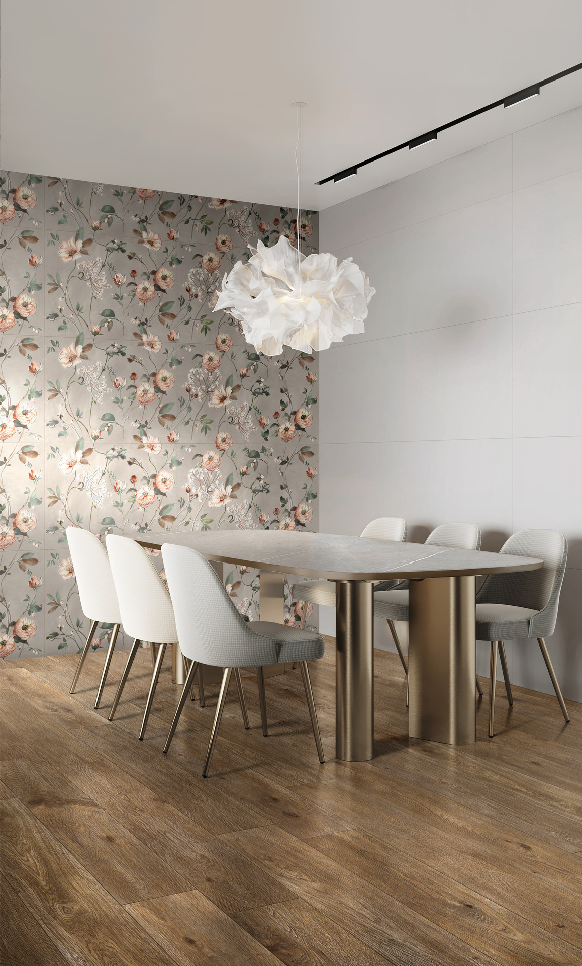 Le soluzioni decorative proposte da Ragno sono pensate per ispirare un arredamento consapevole, in cui il decoro floreale diventa protagonista ma sempre in armonia con il contesto architettonico.