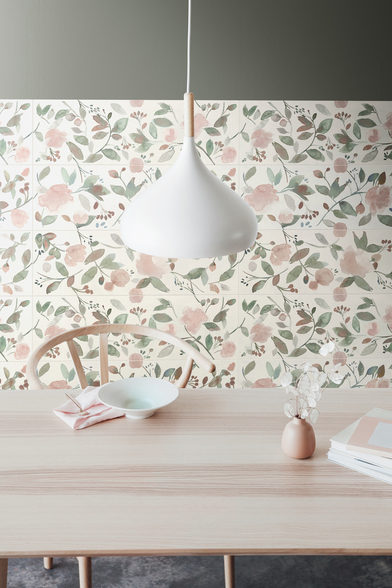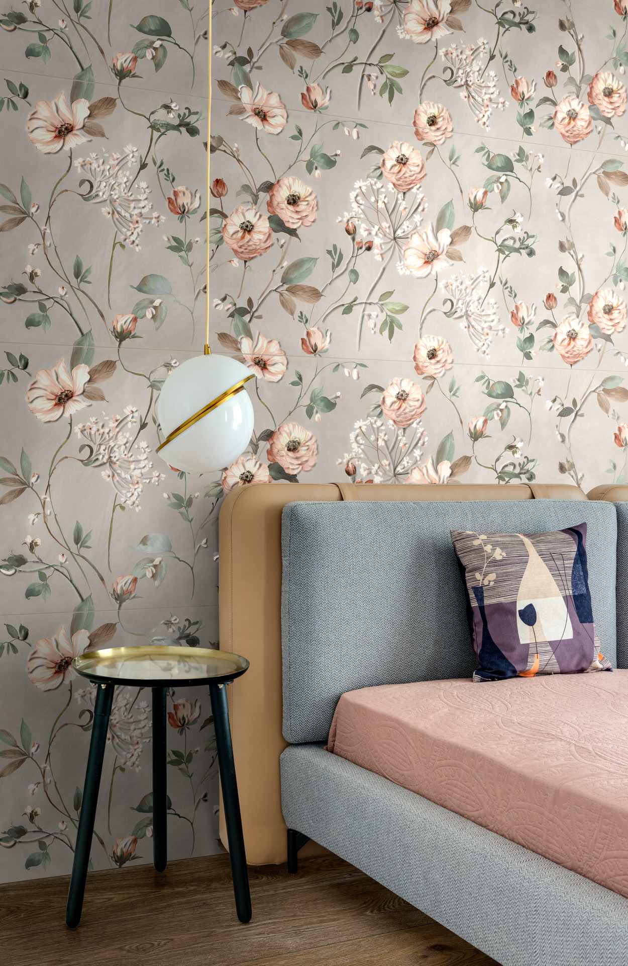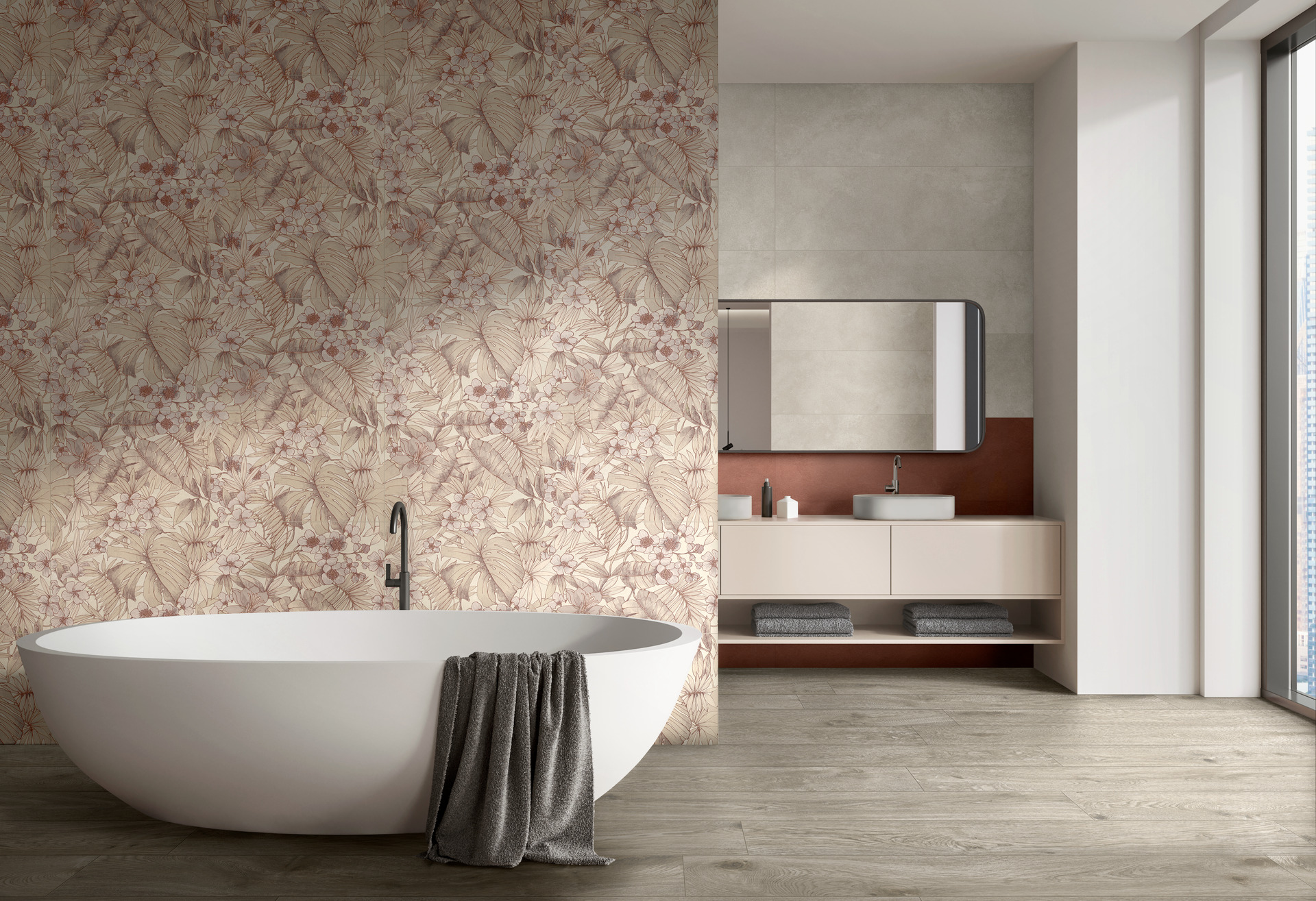 Arredare con le piastrelle floreali effetto carta da parati è un modo per definire l’identità di uno spazio e creare atmosfere accoglienti e raffinate. La scelta cromatica gioca un ruolo centrale: se il rivestimento presenta toni pastello, come cipria, salvia o azzurro polvere, l’abbinamento ideale può avvenire con materiali naturali come il legno chiaro o il lino, per un effetto soft e rilassante. È il caso delle collezioni Stratford e Stratford Wall, che interpretano l’effetto wallpaper con disegni floreali delicati su fondi neutri e polverosi, perfetti per ambienti luminosi e minimalisti.