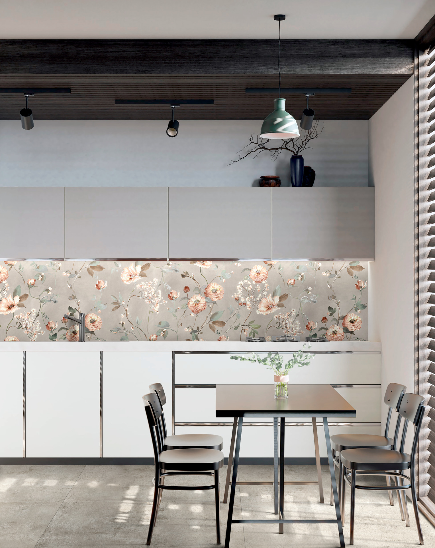 Dal punto di vista estetico, le tecnologie ceramiche di ultima generazione permettono di ottenere dettagli finissimi e texture realistiche che riproducono con precisione le trame tessili e cartacee, mantenendo però tutti i vantaggi funzionali della ceramica. Una scelta che unisce bellezza e tecnica, e che trasforma il decoro floreale in una soluzione durevole, raffinata e perfettamente integrabile in ogni progetto di interior design.