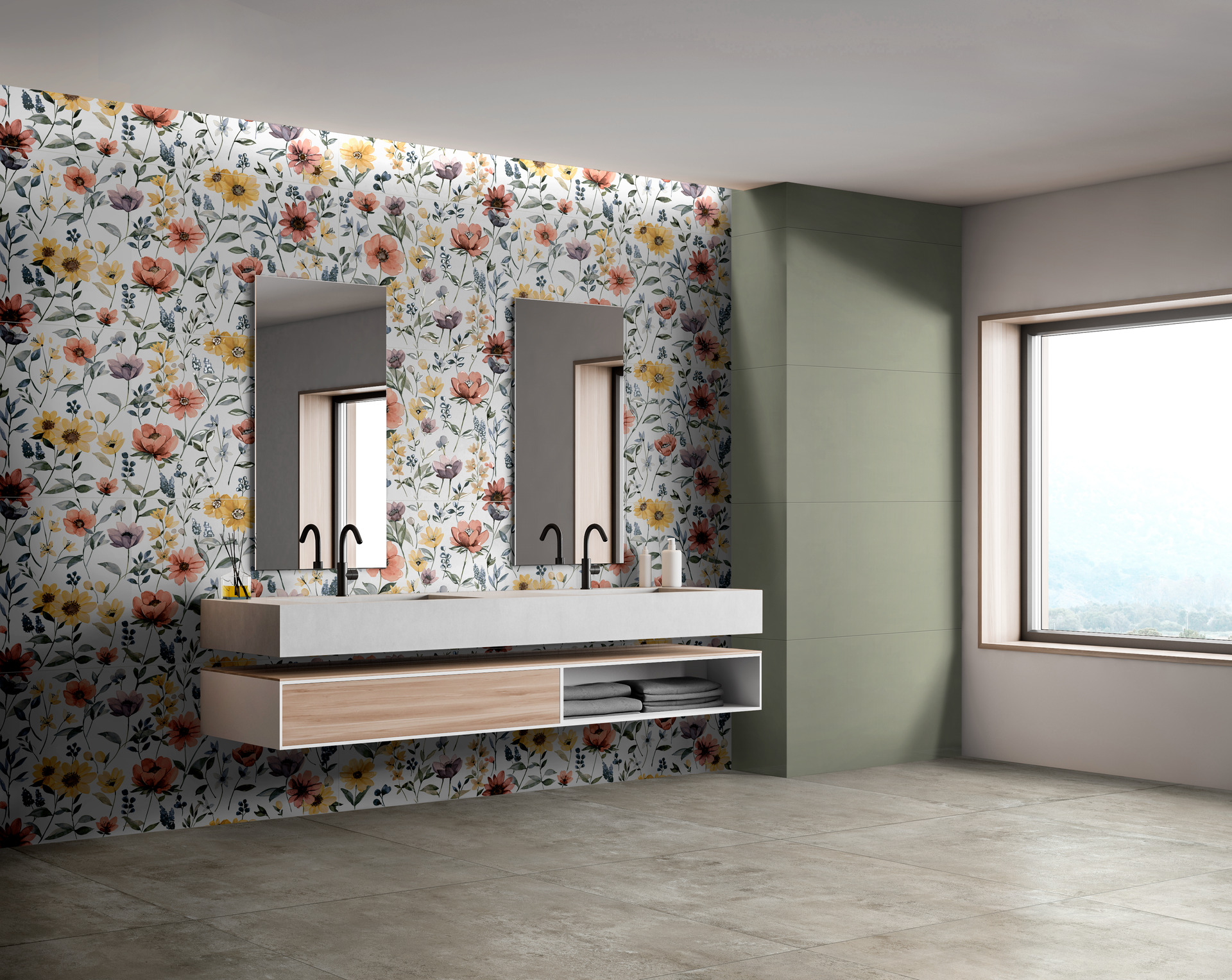 Il bagno è uno degli ambienti dove il rivestimento floreale in gres porcellanato mostra tutta la sua potenzialità estetica e tecnica. Grazie alla resistenza all’umidità e alla facilità di pulizia, le piastrelle decorative floreali diventano una scelta perfetta per pareti doccia, retro lavabo o per creare una parete scenografica a tutta altezza.