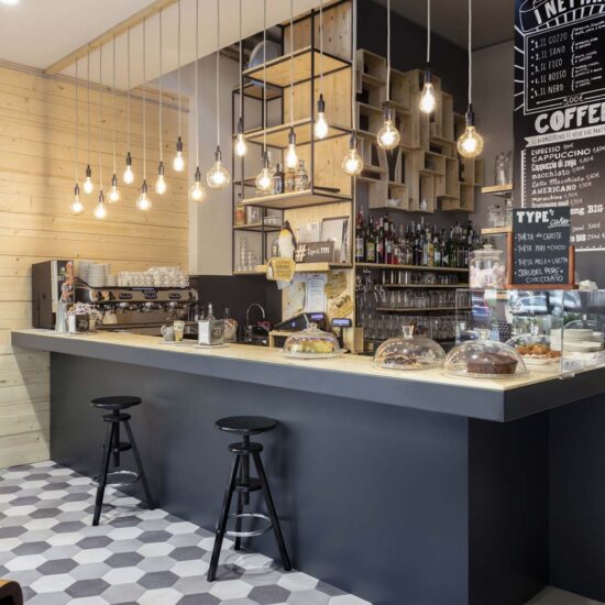 Il banco bar, d’altra parte, è il cuore pulsante del Type. La sua organizzazione versatile e multifunzionale lo rende lo strumento perfetto per servizi diversi in ciascun momento della giornata, dalla prima colazione al dopocena accompagnato da musica ad alto volume.