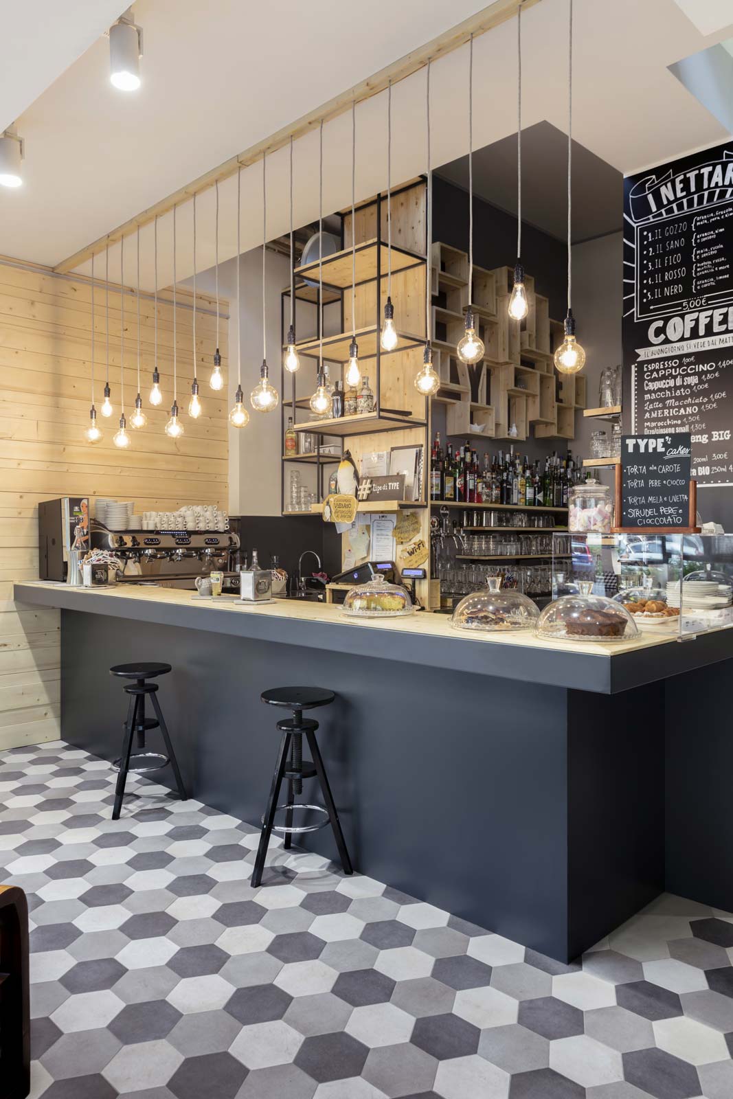 Uno di questi piccoli gioielli è il Type, cocktail bar di gusto berlinese che si incontra al civico 34 percorrendo la via Borsieri, a pochi passi dal celebre Bosco Verticale. La soglia posta sull’ampia vetrina su strada apre la vista, all’interno, a una piacevole alternanza tra legno di abete e un tappeto di piastrelle declinate in diverse tonalità di grigio.