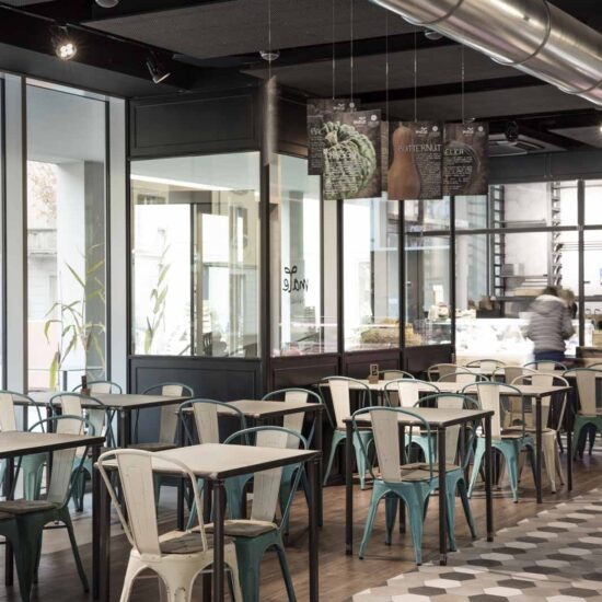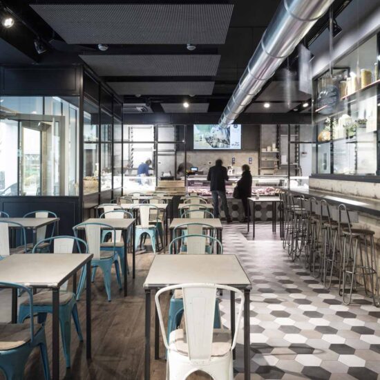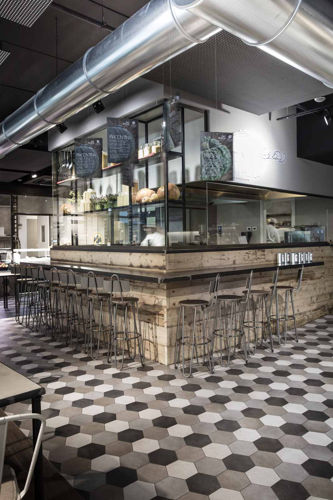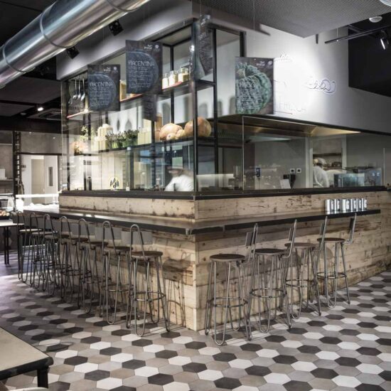 Sono le piastrelle esagonali della collezione Rewind di Ragno, scelte nelle varianti polvere, vanilla e peltro (21 x 18,2 cm). A queste sono affidati due compiti importanti: disegnare il pavimento attorno al volume del banco bar e definire un motivo decorativo intorno al logo del locale, posto sulla parete di fondo dell’area occupata dai tavoli per la consumazione dei pasti e la conversazione tra gli ospiti.