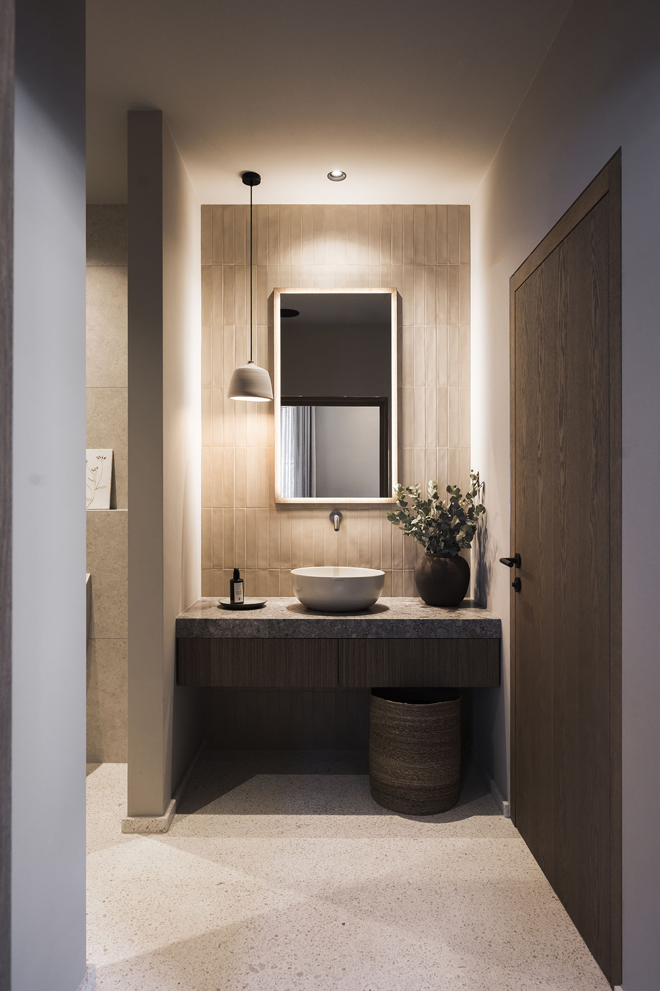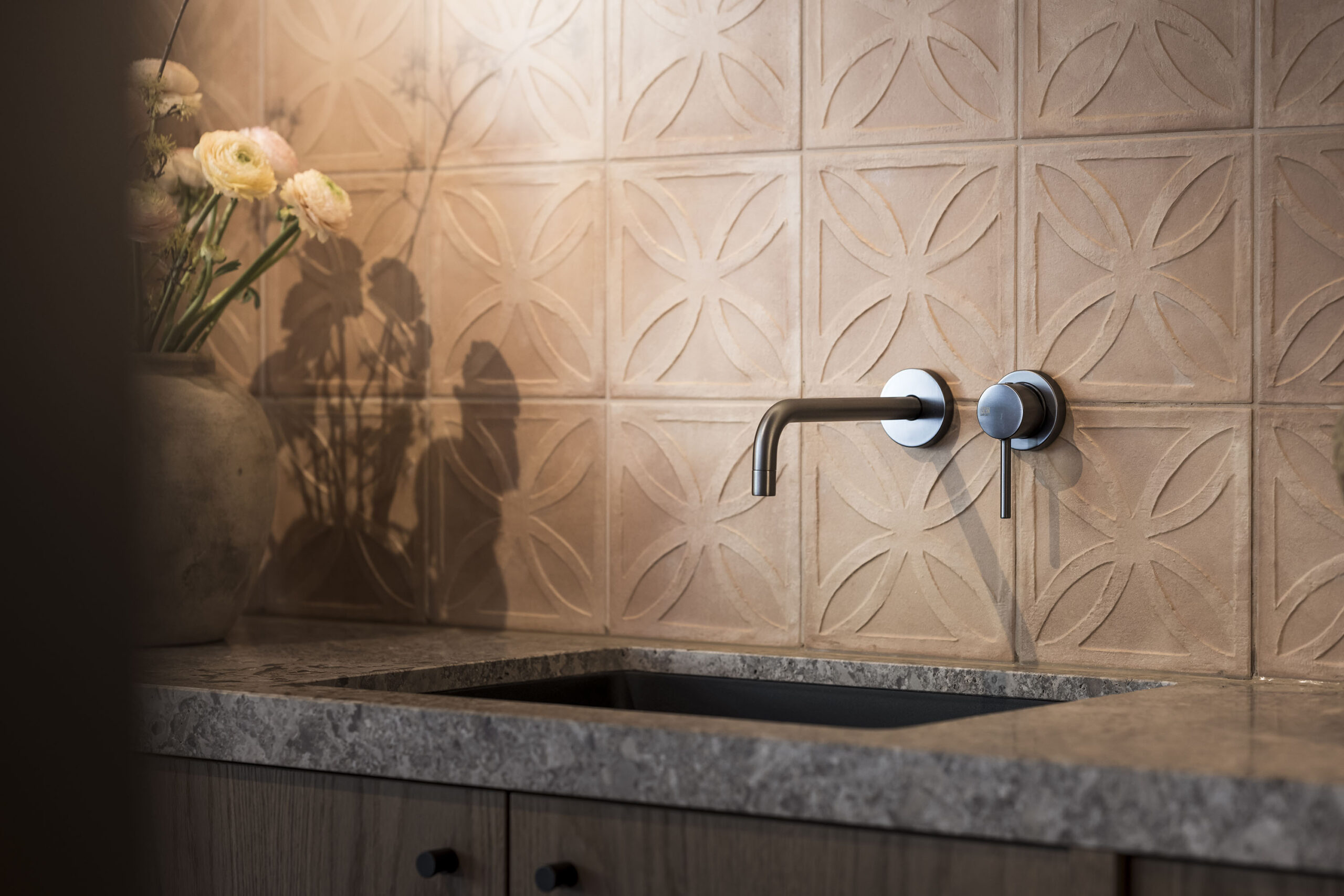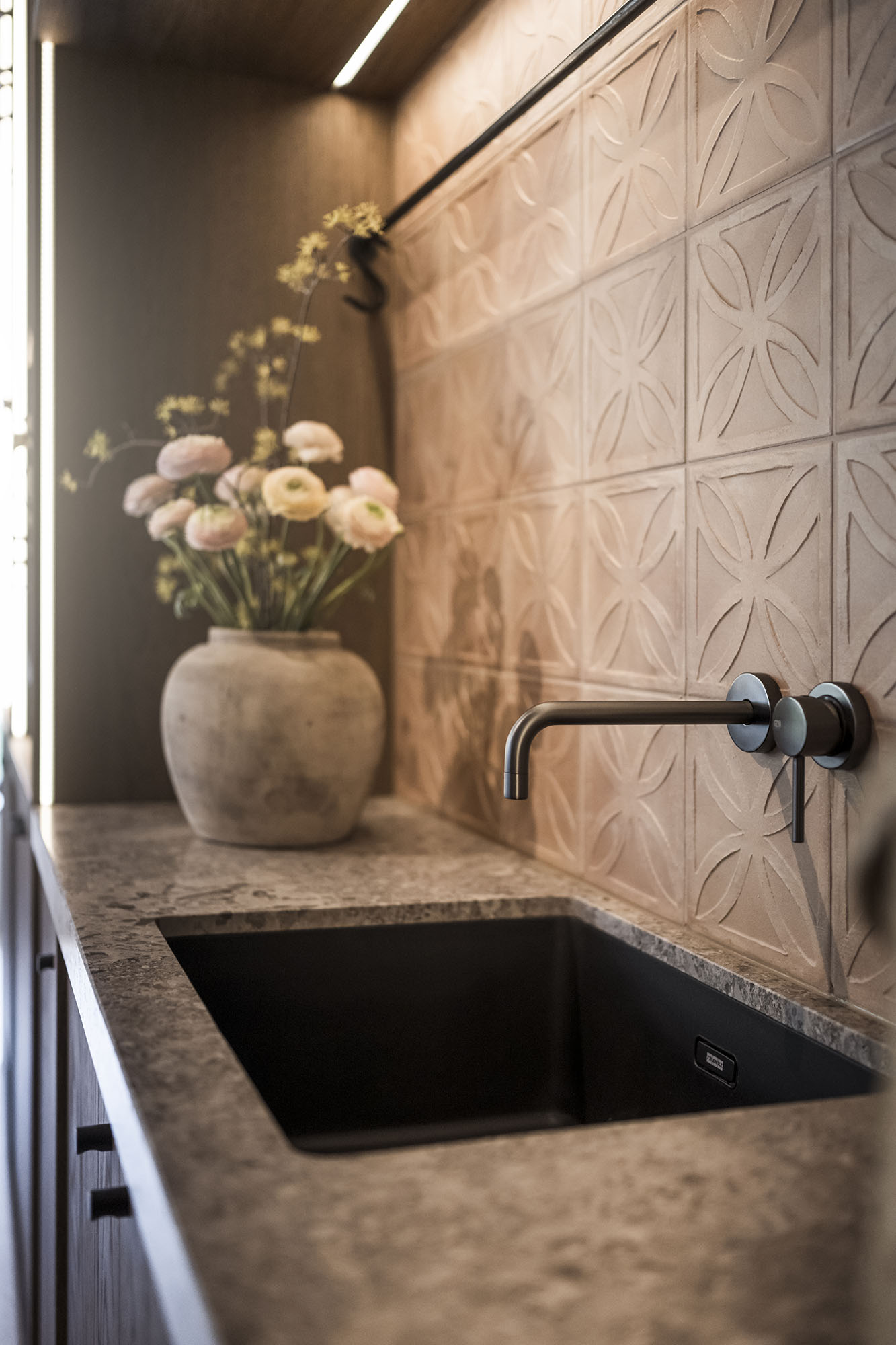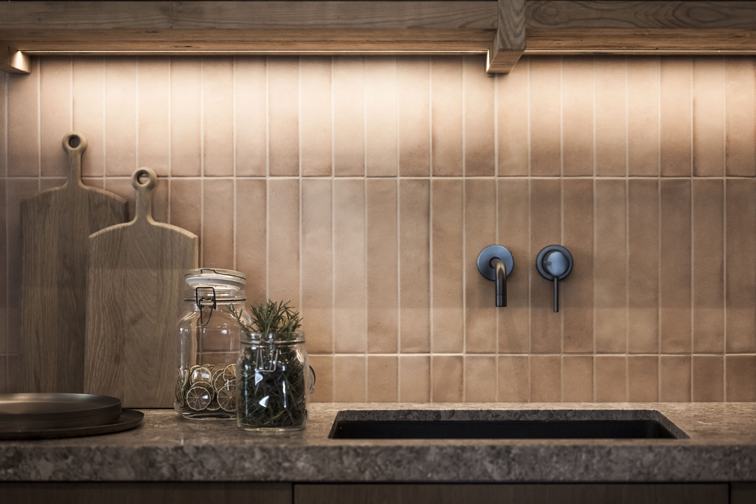 L’ispirazione materica nasce dal cotto lavorato a mano, con bordi marcati e leggere nuvolature sulla superficie. Le piastrelle che compongono il bancone del bar sono accompagnate da un inaspettato backsplash realizzato nella versione strutturata 3D Gelosia nel colore Cotto. Amuri, nella versione mattoncino 5,3×30 cm, è stata utilizzata anche per rivestire la cucina e il bagno, creando continuità estetica e un richiamo alla tradizione artigianale.