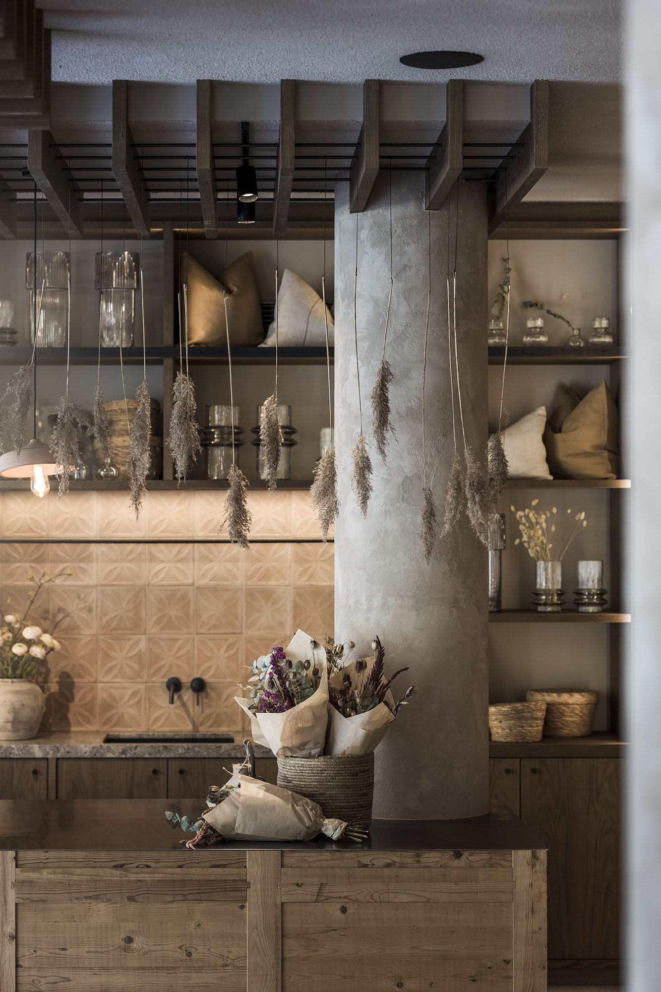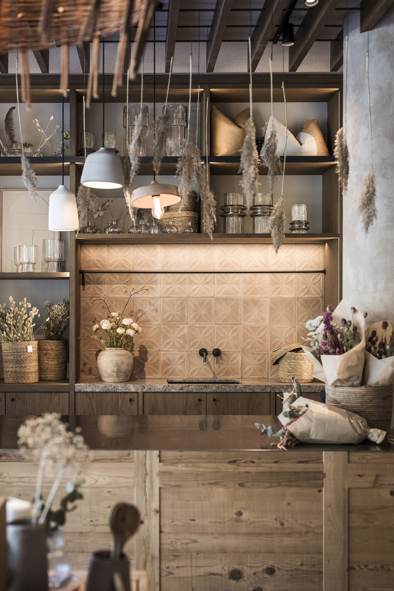 Lo spazio si articola in una sequenza fluida: una postazione per i fiori, una vetrina per i vini, un grande tavolo da lavoro e scaffali che ospitano oggetti di design. Ogni zona è progettata per favorire l’esplorazione e la narrazione.