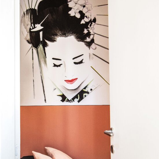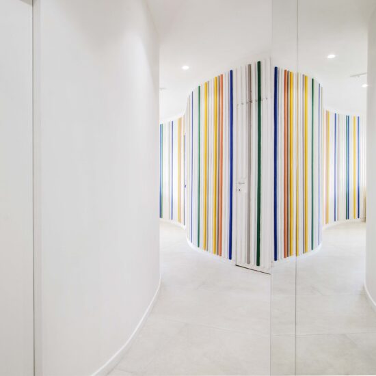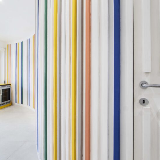 Il gres in grande formato e rettificato 75×150 della collezione Boom, scelto nella luminosa variante Luce, disegna uno sfondo continuo dall’indiscutibile autonomia estetica sulla cui base viene intessuta la trama delle nuove tramezzature, funzionale alla suddivisione dell’appartamento originario in cinque suites e altrettanti bagni privati.