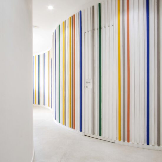 Il primo obiettivo trova riscontro, in fase di realizzazione del progetto, in un percorso fluido, delimitato da pareti dall’andamento dolcemente curvilineo che, a partire dall’ingresso, tocca via via gli accessi a tutte le suites e li accompagna al finale più gradito e sorprendente: un ampio balcone attrezzato per il relax, la consumazione dei pasti e l’intrattenimento collettivo.