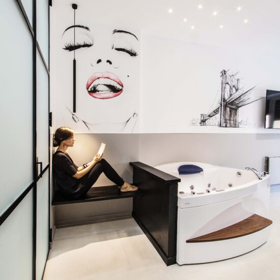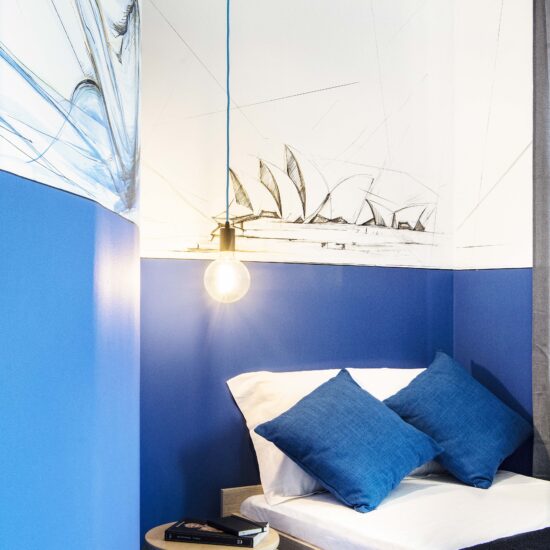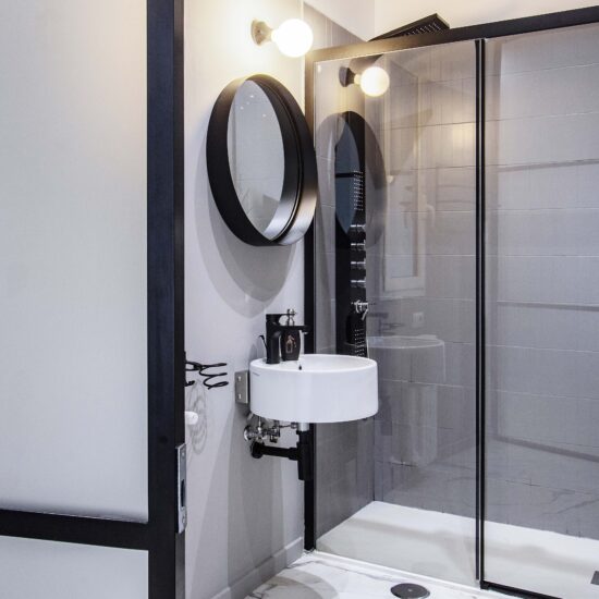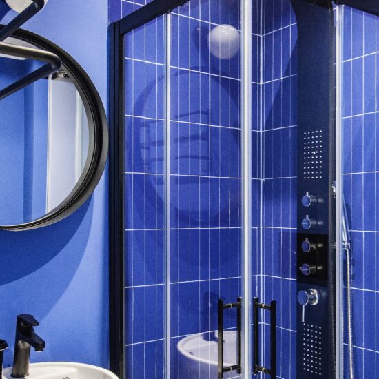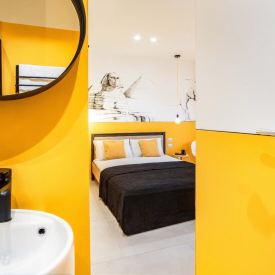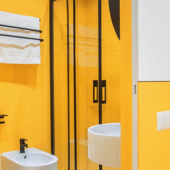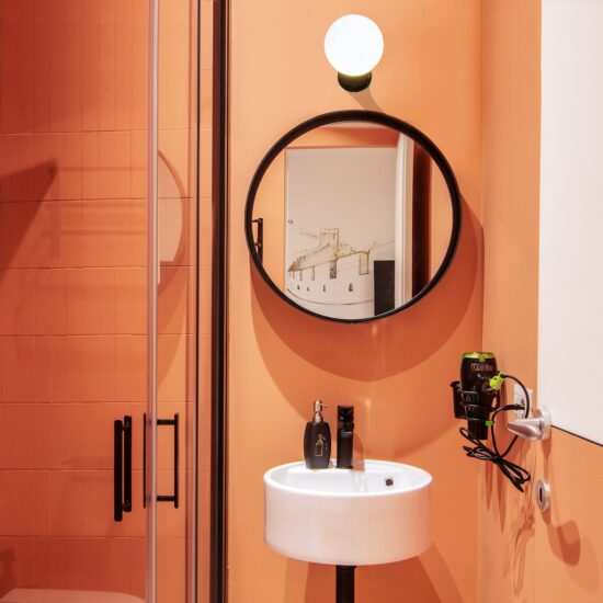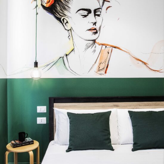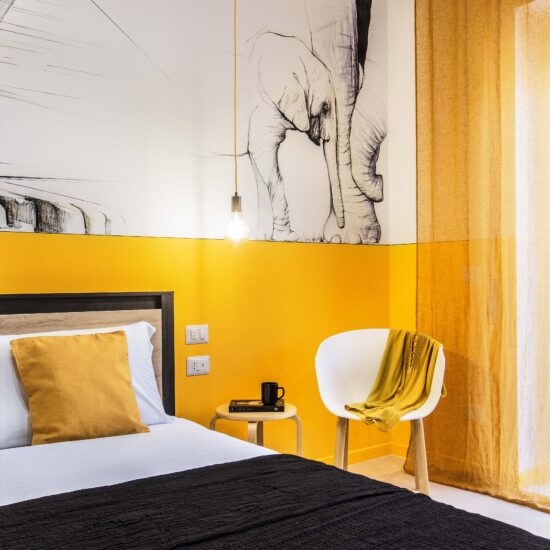 A parete, invece, è il colore a essere protagonista. Il bagno di ciascuna suite ha il suo: il criterio è quello di catalogare l’offerta ricettiva attraverso un parametro visivamente stimolante, immediatamente riconoscibile e, nel tempo, permanente nel ricordo del soggiorno romano.