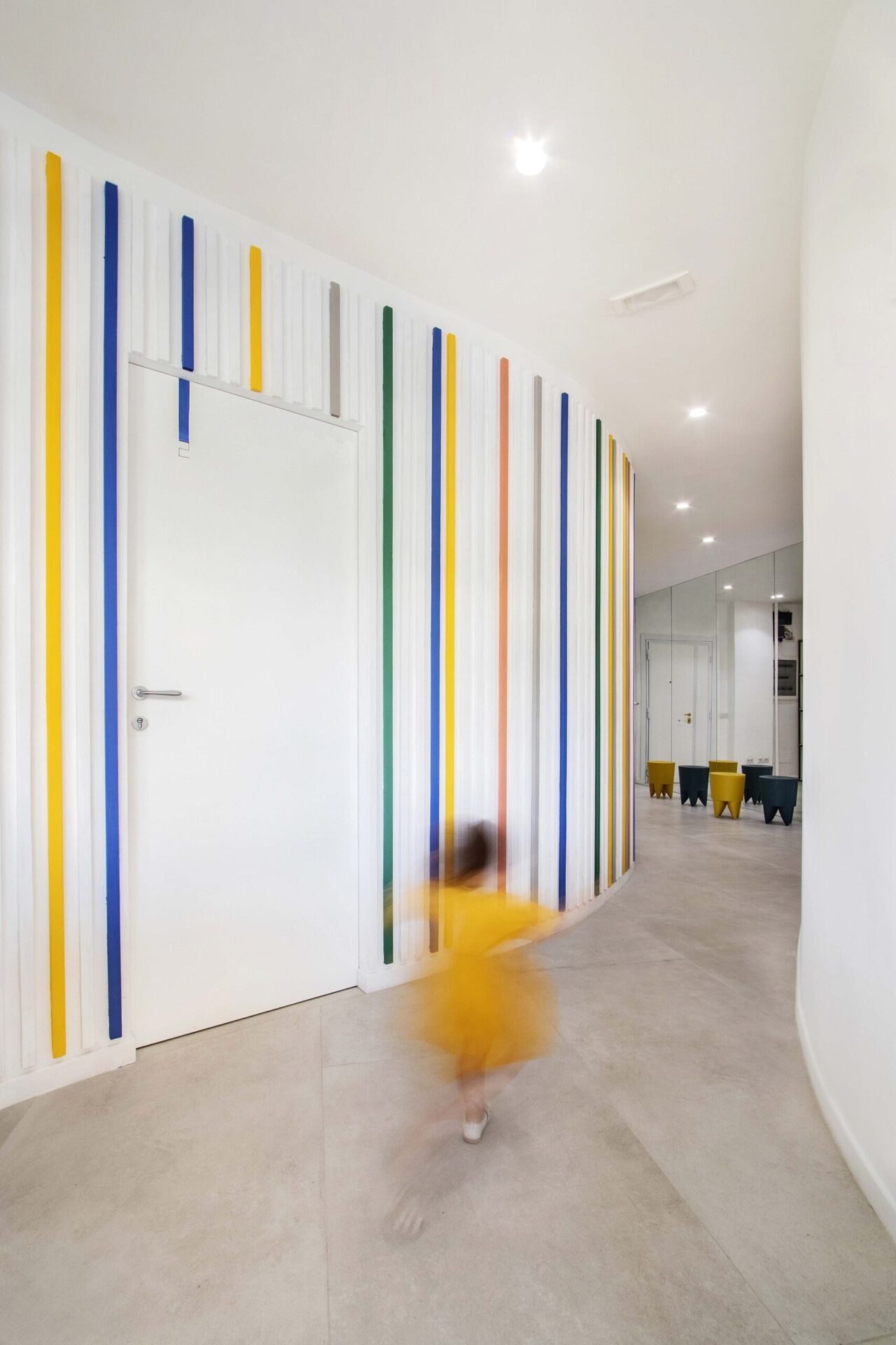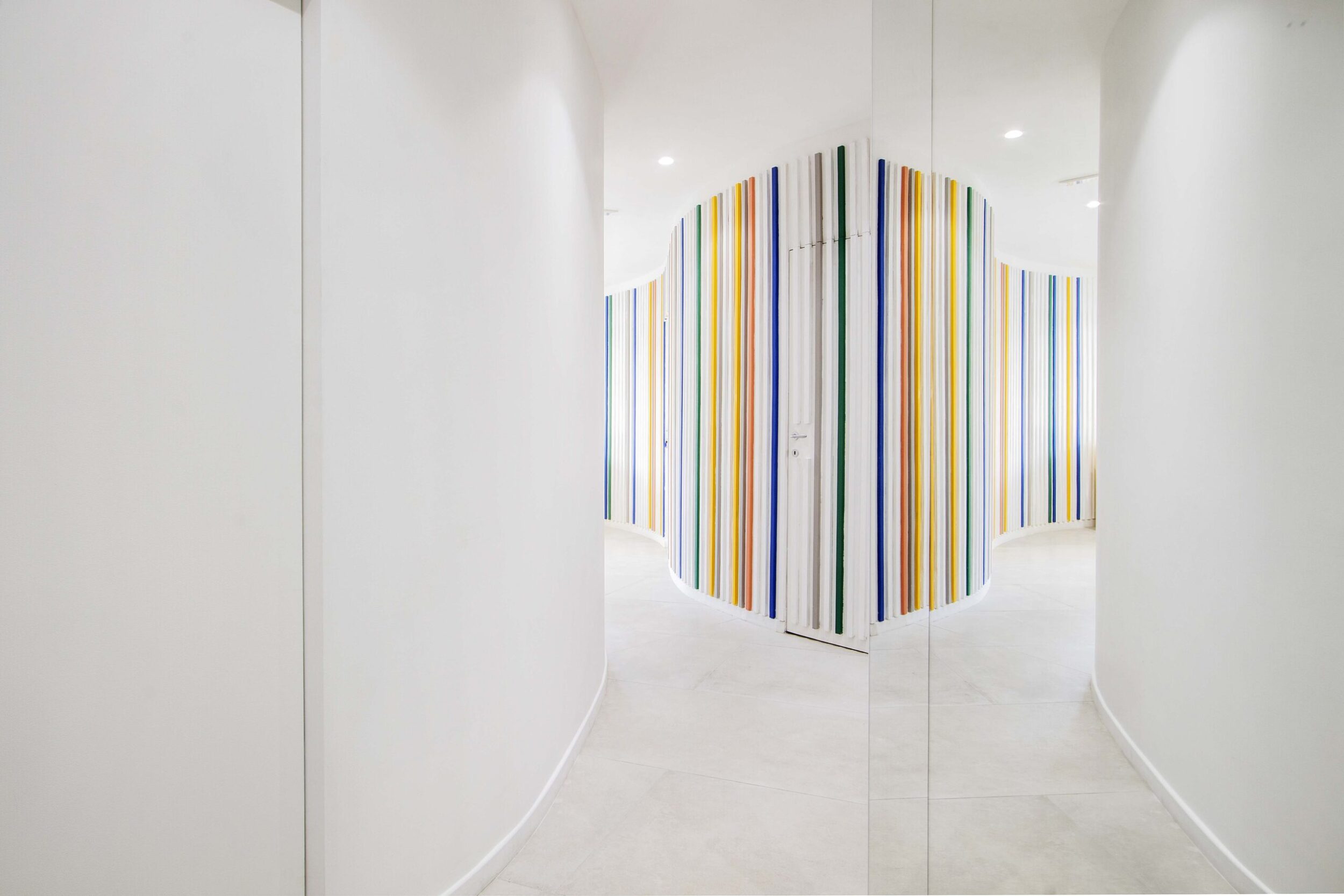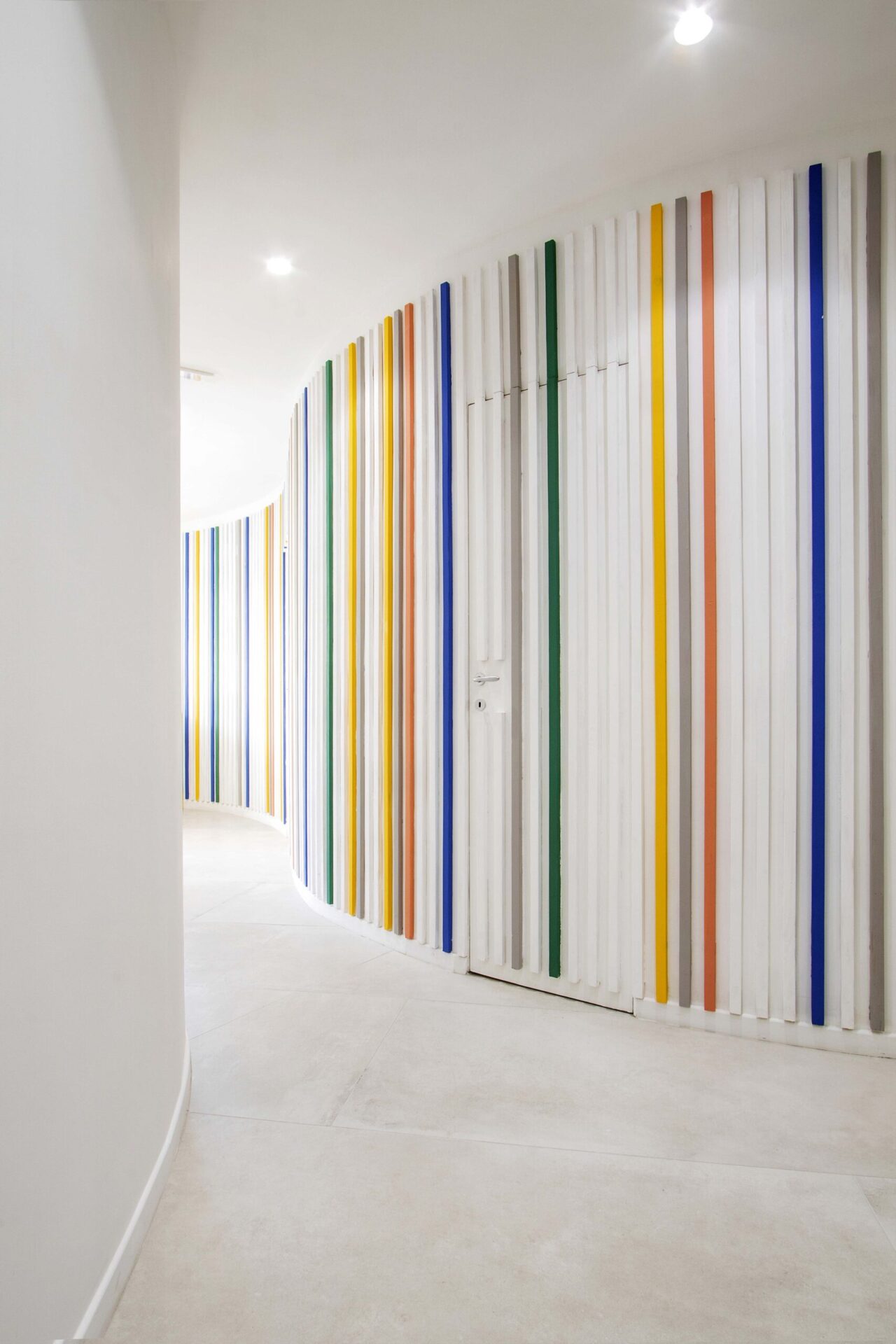 Il primo obiettivo trova riscontro, in fase di realizzazione del progetto, in un percorso fluido, delimitato da pareti dall’andamento dolcemente curvilineo che, a partire dall’ingresso, tocca via via gli accessi a tutte le suites e li accompagna al finale più gradito e sorprendente: un ampio balcone attrezzato per il relax, la consumazione dei pasti e l’intrattenimento collettivo.