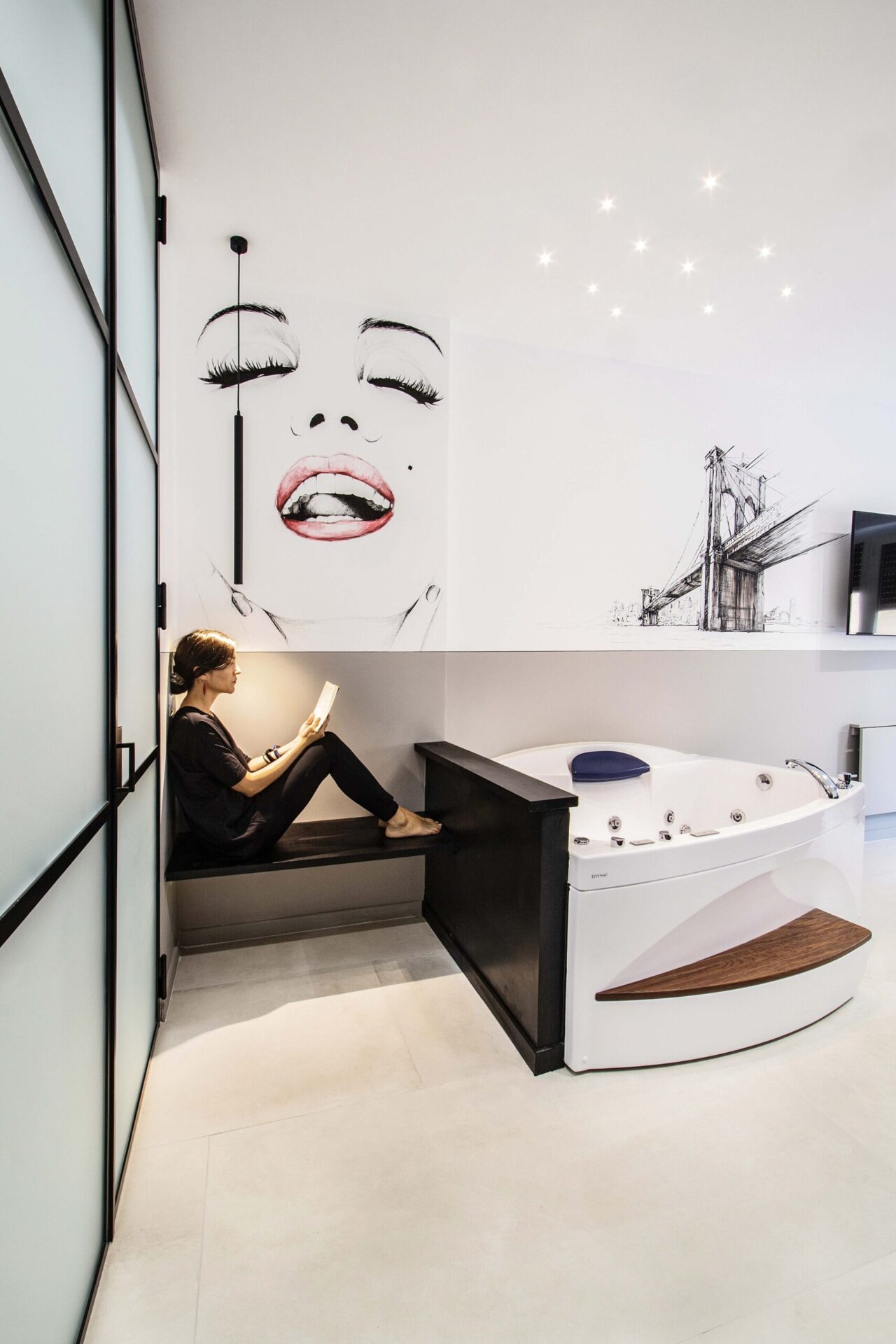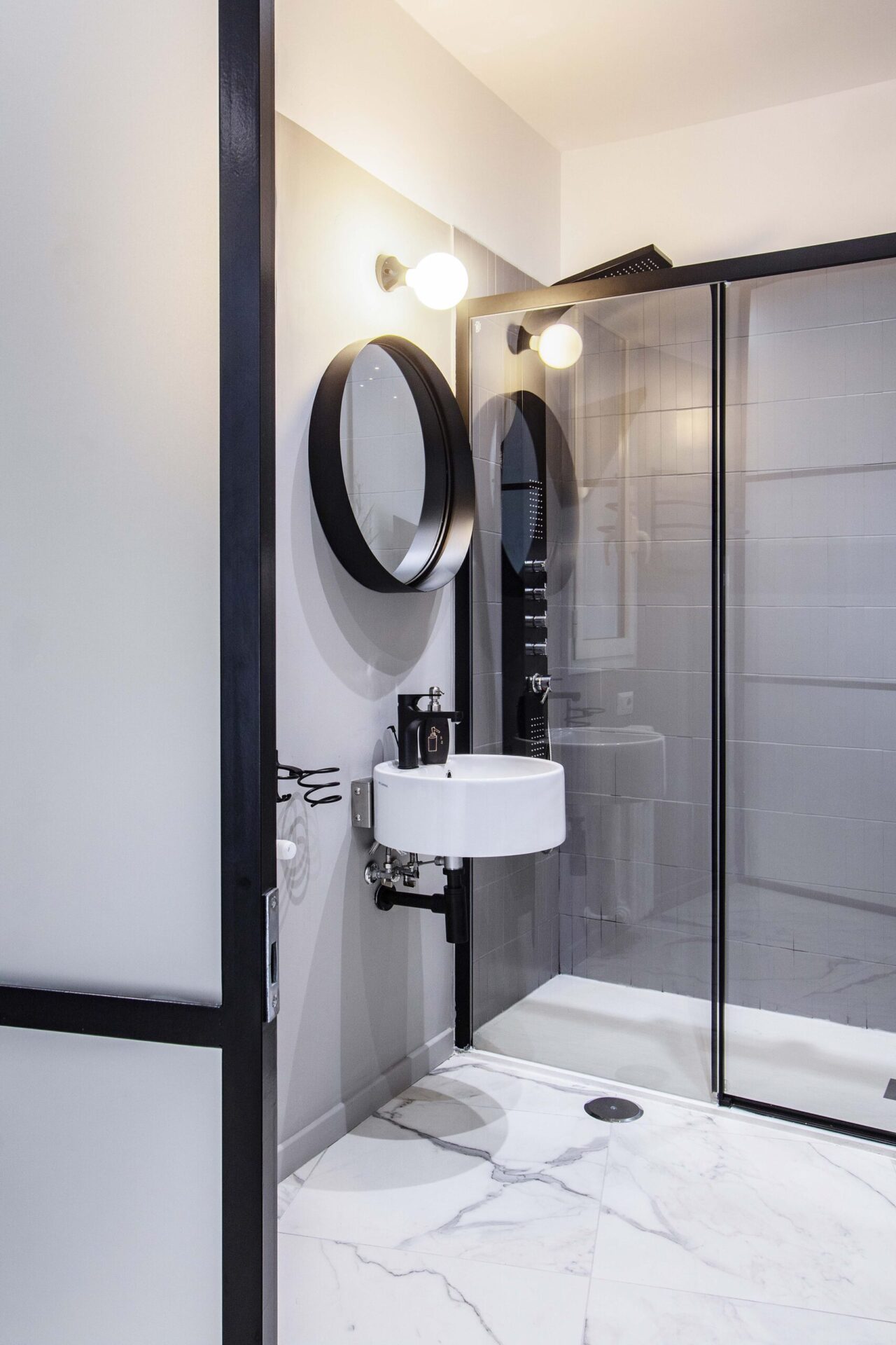 Il gres in grande formato e rettificato 75×150 della collezione Boom, scelto nella luminosa variante Luce, disegna uno sfondo continuo dall’indiscutibile autonomia estetica sulla cui base viene intessuta la trama delle nuove tramezzature, funzionale alla suddivisione dell’appartamento originario in cinque suites e altrettanti bagni privati.