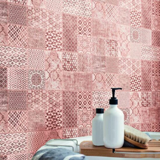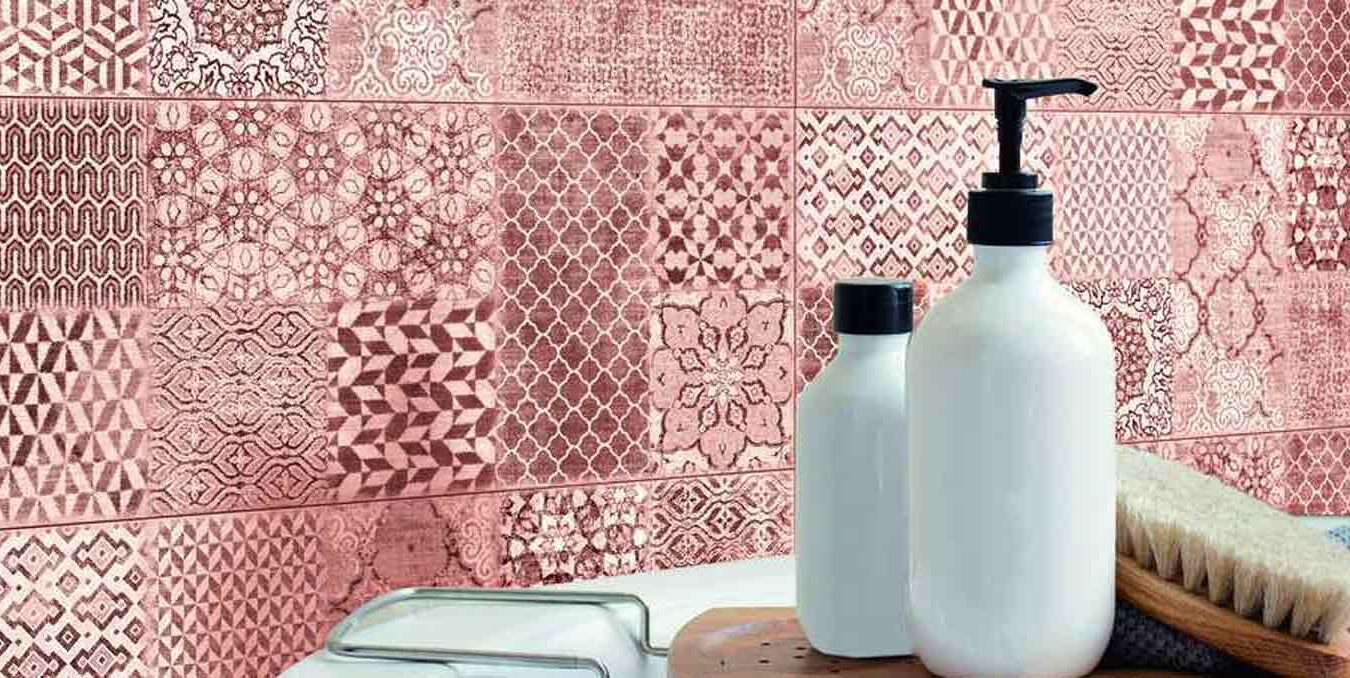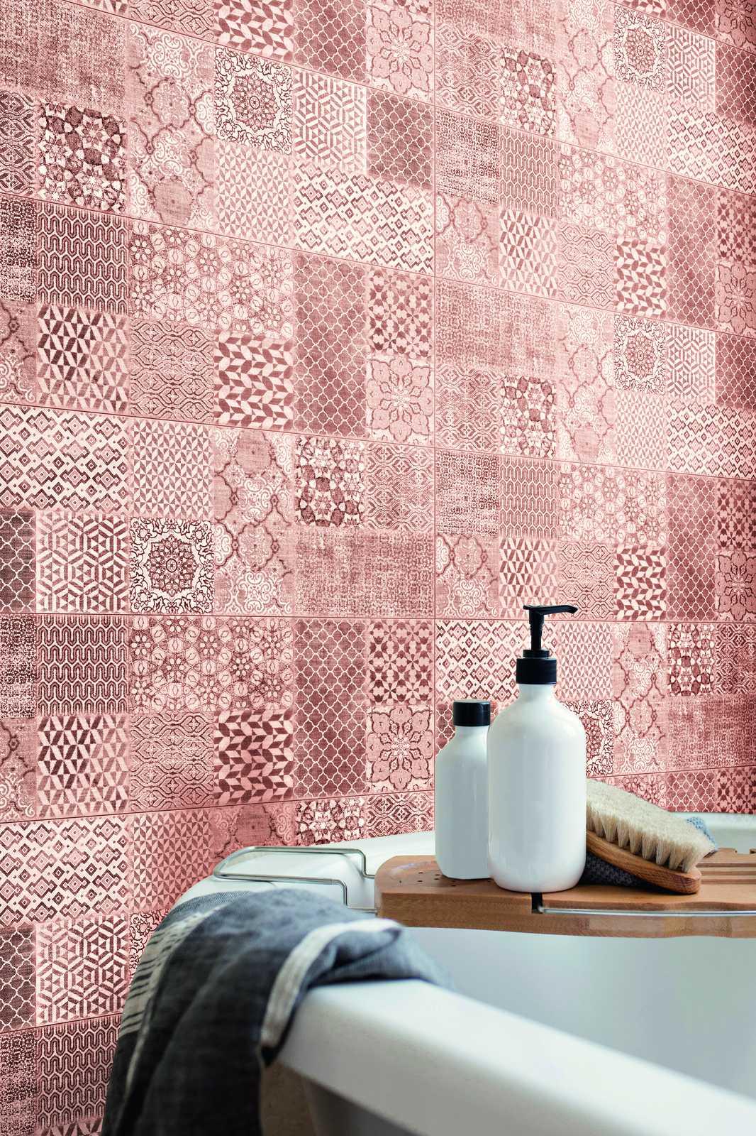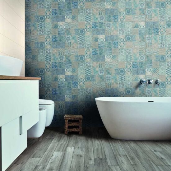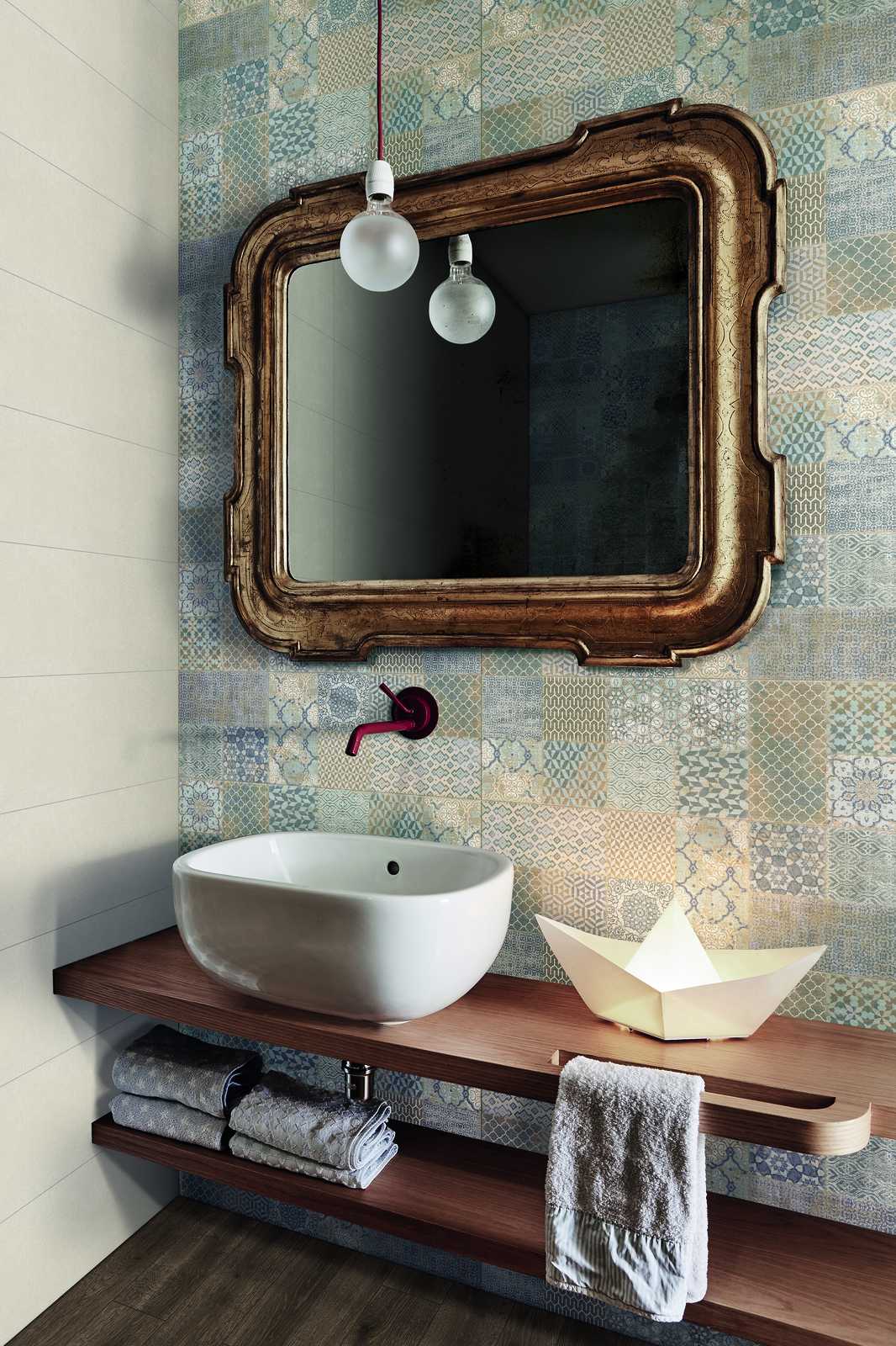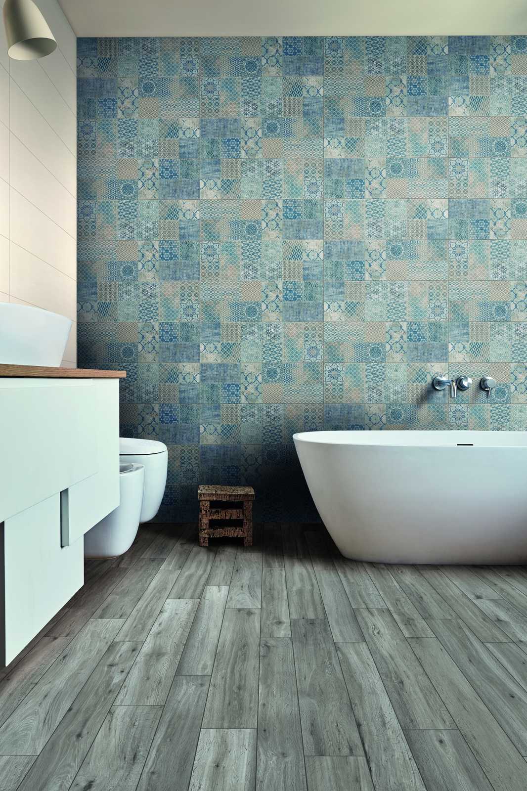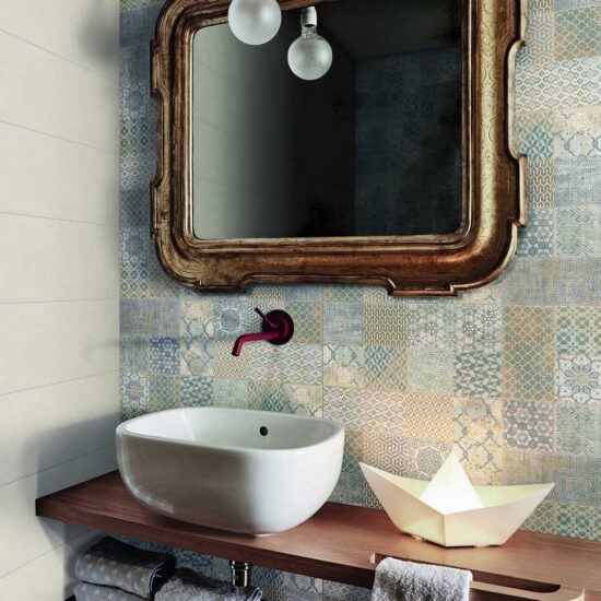 Arazzo è la proposta dal disegno più ricercato (un patchwork di motivi anche molto diversi tra loro) ed è disponibile in due colorazioni, calda e fredda, da abbinare alle piastrelle monocolore.