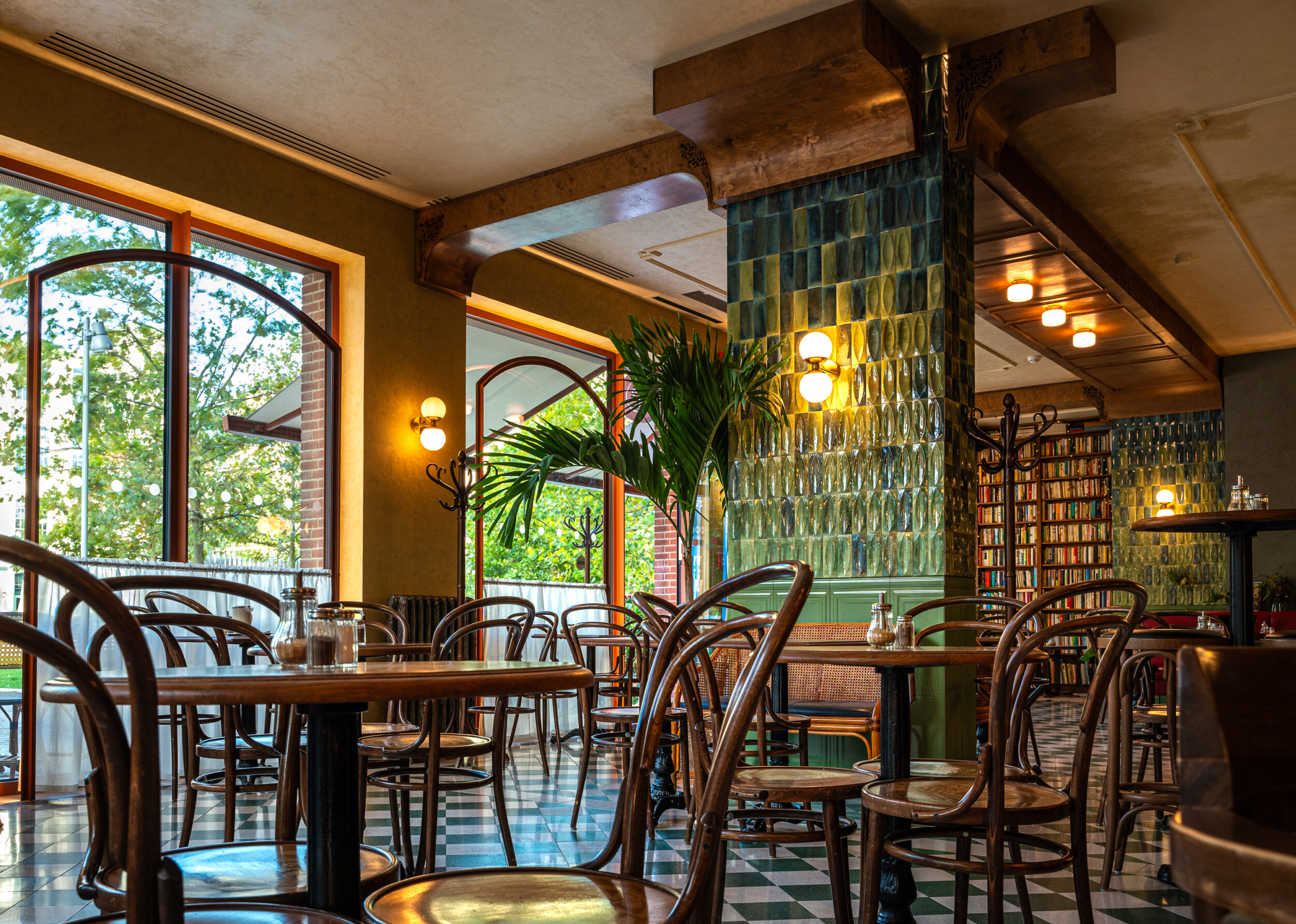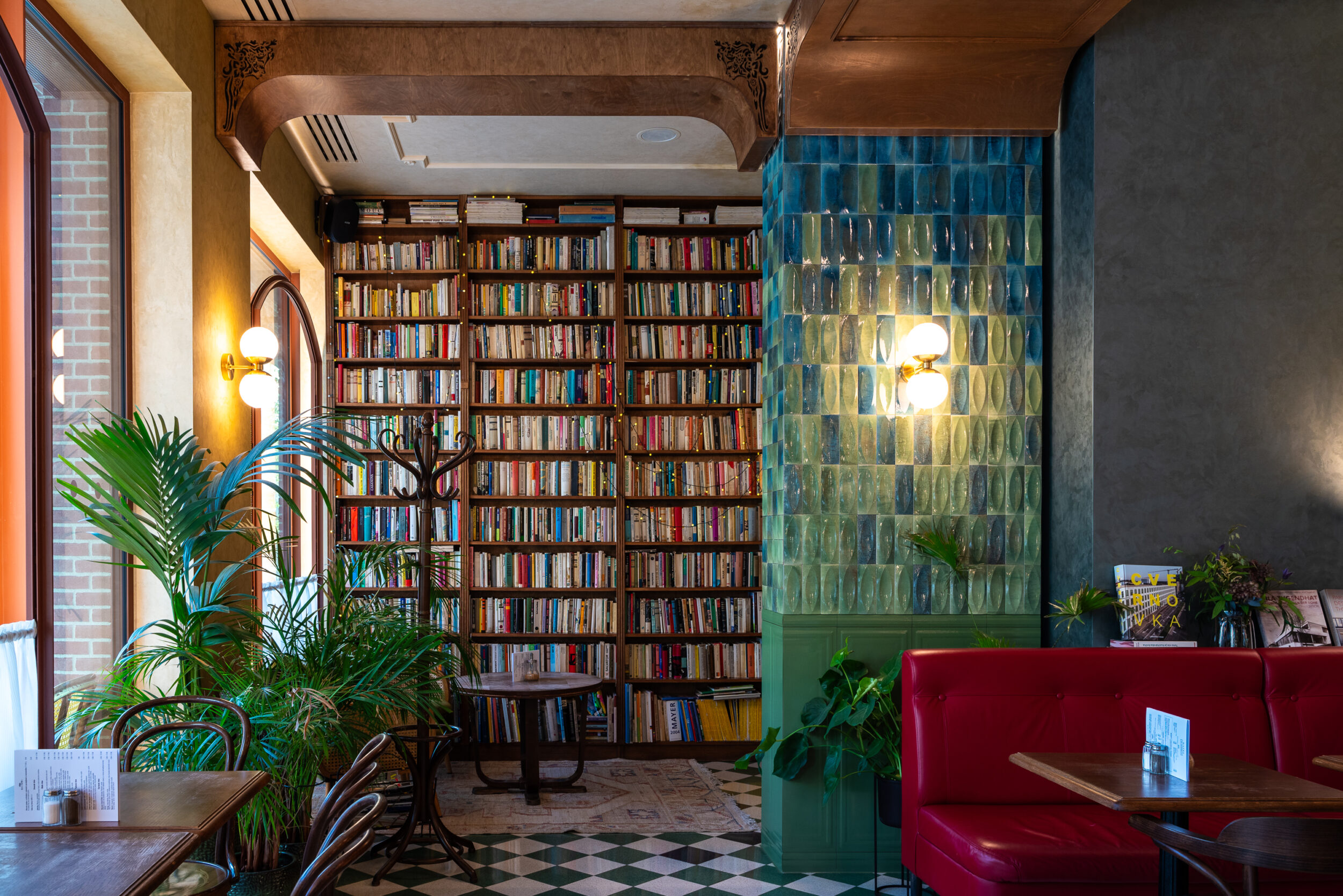 Le luci calde esaltano le sfumature verdastre e bluastre del rivestimento, creando un raffinato gioco di riflessi che dona al bistrot un’atmosfera accogliente e dinamica. L’interior design è un dialogo tra modernità e memoria: la libreria in legno si integra con le piastrelle Gleeze, mentre dettagli vintage, divani rossi e piante decorative completano l’ambiente con un tocco di naturale eleganza. Il pavimento a scacchiera verde e bianco aggiunge profondità visiva e rafforza l’identità dello spazio.