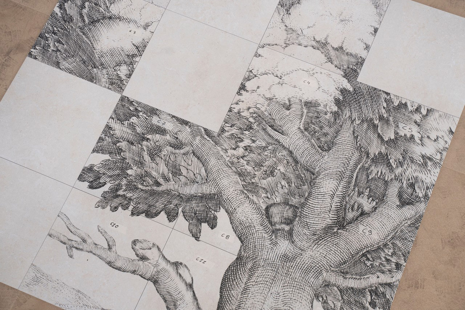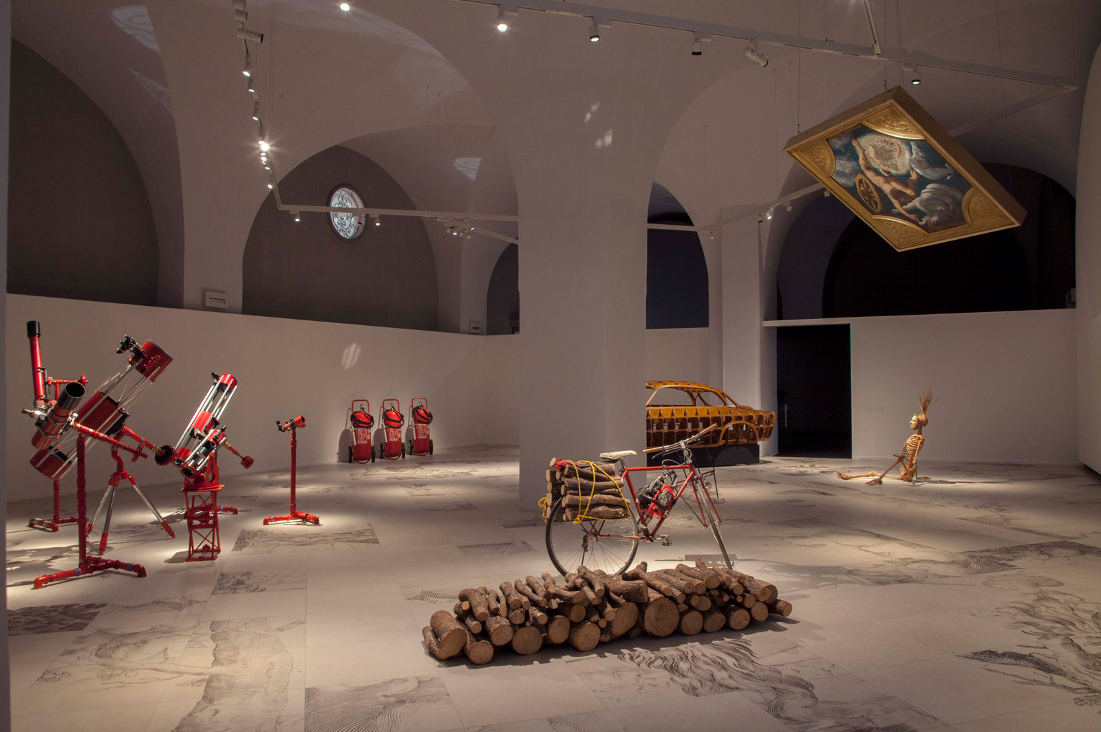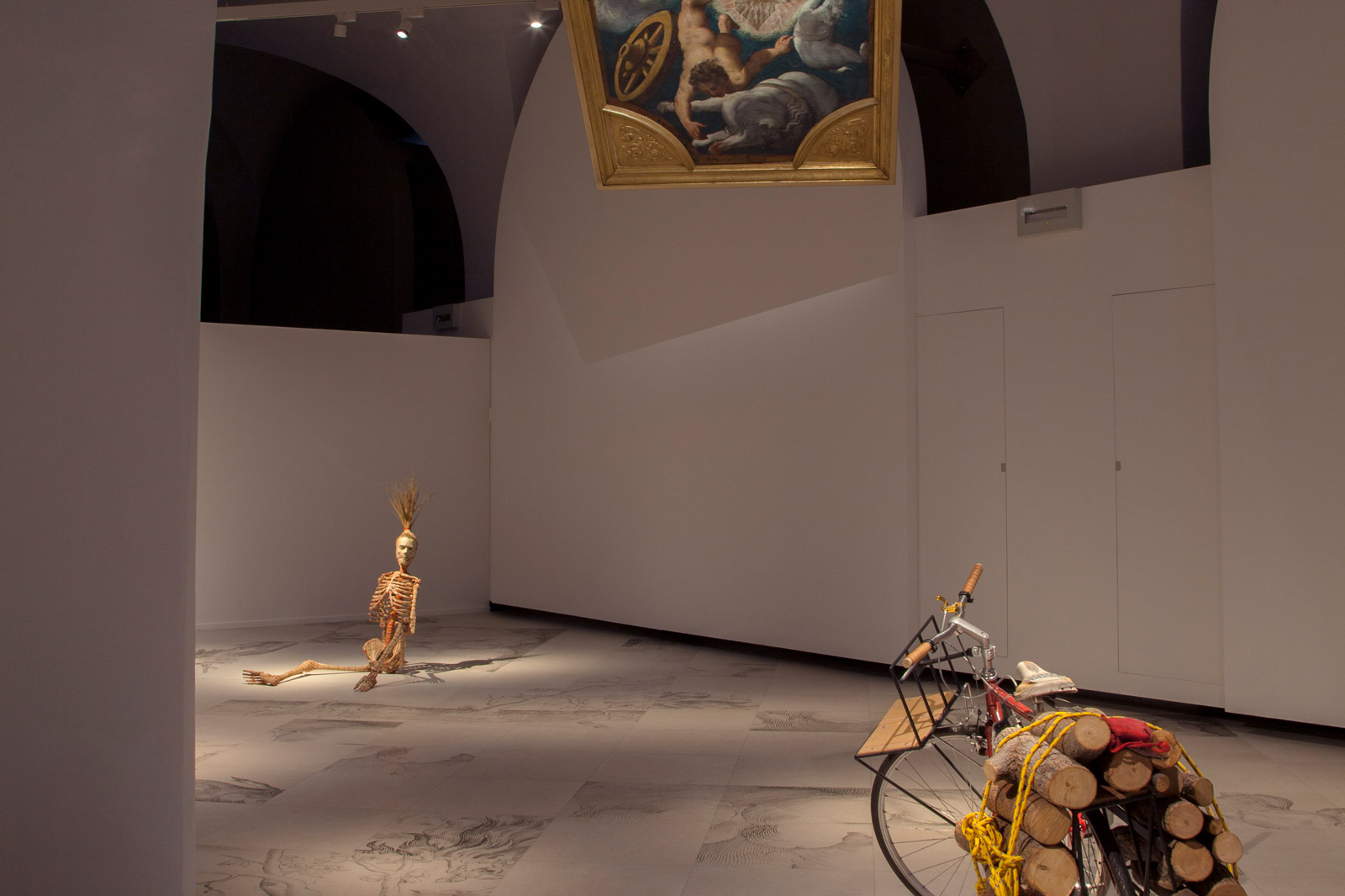 L’installazione ha messo in relazione il ciclo pittorico di Tintoretto con xylografie e opere contemporanee, recuperate dagli archivi di Gallerie Estensi, per far riflettere sugli effetti del cambiamento climatico. Parte integrante dell’opera è lo speciale pavimento in gres su disegno dell’artista realizzato da Marazzi.